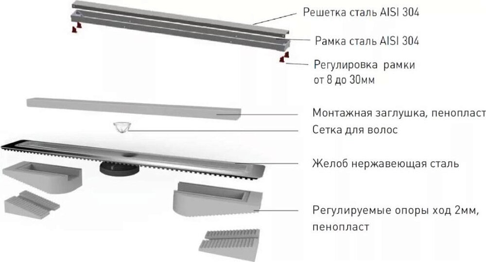 | ВКоробке | Душевой желоб - 1 шт. Решетка - 1 шт. Сифон - 1 шт. Комплект опор - 1 шт. Прокладка гидроизолирующая - 1 шт. Инструкция - 1 шт. |