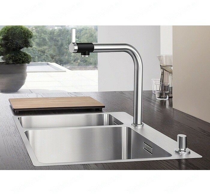 Смеситель Blanco Vonda из нержавеющей стали с полировкой. Данная модель смесителя vonda с эргономичным рычагом управления который расположен спереди. Излив смесителя vonda с чёрной отделкой и приятной мягкой на ощупью прорезиненной поверхностью. Высокий излив позволяет с лёгкостью наполнять высокие кастрюли и вазы. Прекрасно сочетается с чашами для под стольного монтажа.