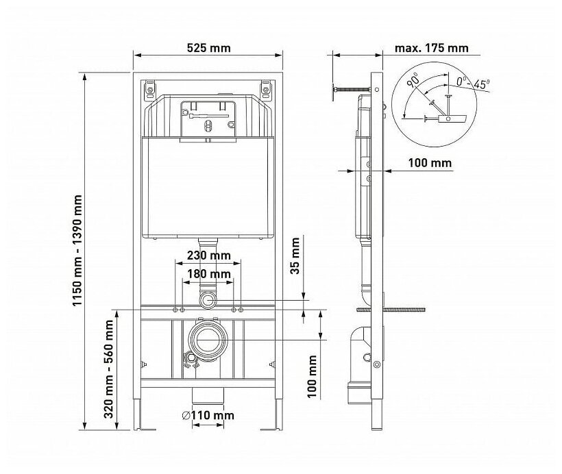 - Габариты инсталляции (Ш х В): 525 x 1150-1390 мм