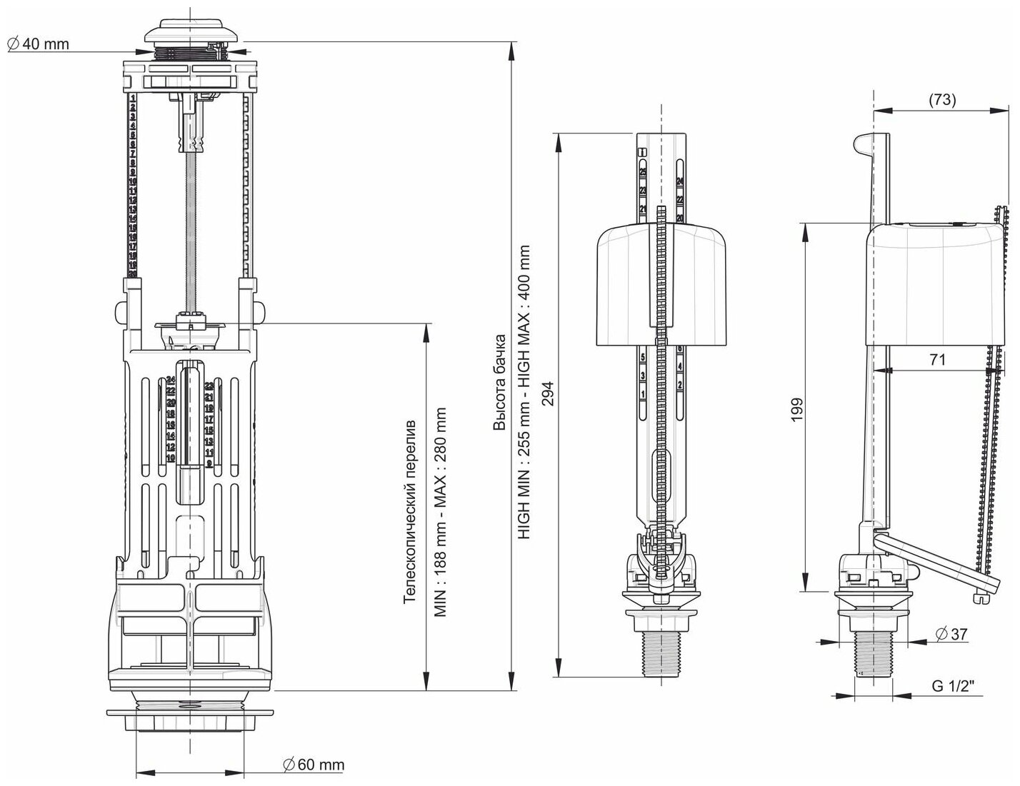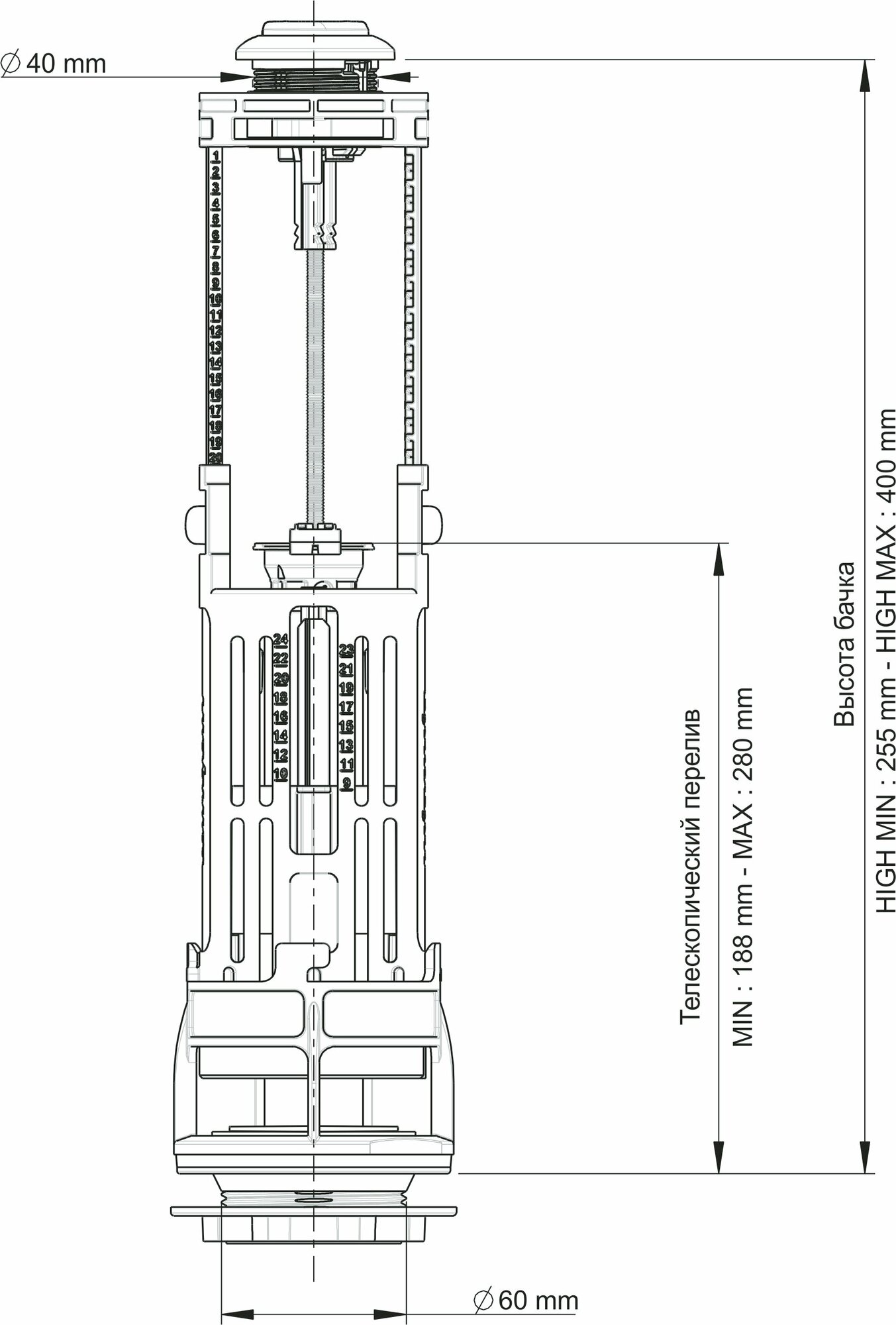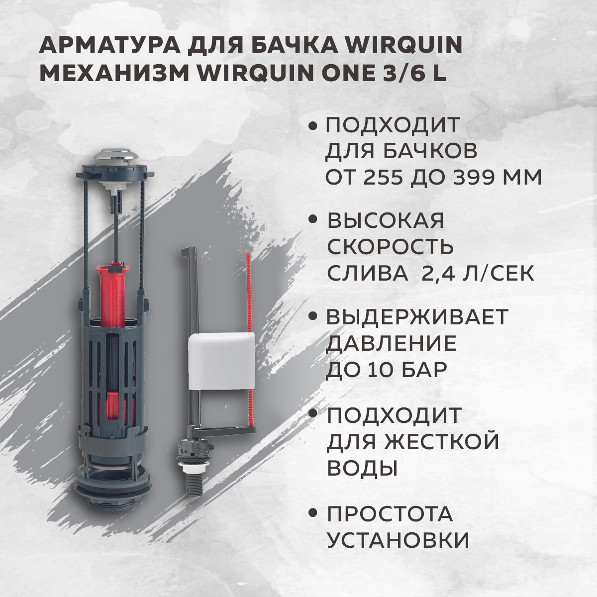 Арматура для унитаза водосливная WIRQUIN кнопочная в 2-х режимах Простой в установке механизм можно установить самостоятельно, не прибегая к помощи сантехника. Удобная кнопка с легким нажимом. Слив воды в WIRQUIN ONE происходит после нажатия.Преимущества:- прост в установке;- постоянный объем слива при нажатии кнопки;- инновационная конструкция кронштейна;- автоматическая регулировка без дополнительных замеров;- регулировка смыва;- регулировка высоты;- телескопический перелив.