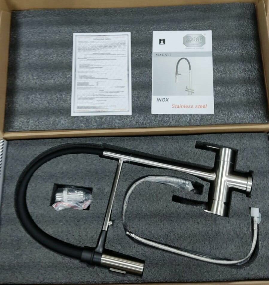 Практичный и очень стильный смеситель Zorg SZR-3030 Grafit MAGNIT изготовлен целиком из нержавеющей стали SUS 304. Брашированная стальная поверхность препятствует появлению известкового налета. Смеситель Zorg SZR-1010 grafit magnit можно подключать к любому бытовому фильтру всех производителей.Характеристики Zorg SZR-3030 GRAFIT MAGNIT: Профессиональный кухонный смеситель Материал корпуса нержавеющая сталь Габаритные размеры: 510 х 220 мм Высота излива: 200 мм Съемный гибкий излив с магнитным держателем, работает в режимах - струя/душ Включение фильтрованной воды - нажитие кнопки Монтажный размер D 35 мм Керамический дисковый картридж и керамические уплотнители Стабилизирующая пластина для увеличения устойчивости смесителя Соответствует категории шумности I Соответствует стандартам DIN DVGW Комплектация ZORG SZR-3030 GRAFIT MAGNIT: Смеситель в фирменной упаковке, гибкая подводка 45 см с гайкой 3/4 (Российский стандарт), комплект крепежа, переходник-цанга для подключения фильтра.