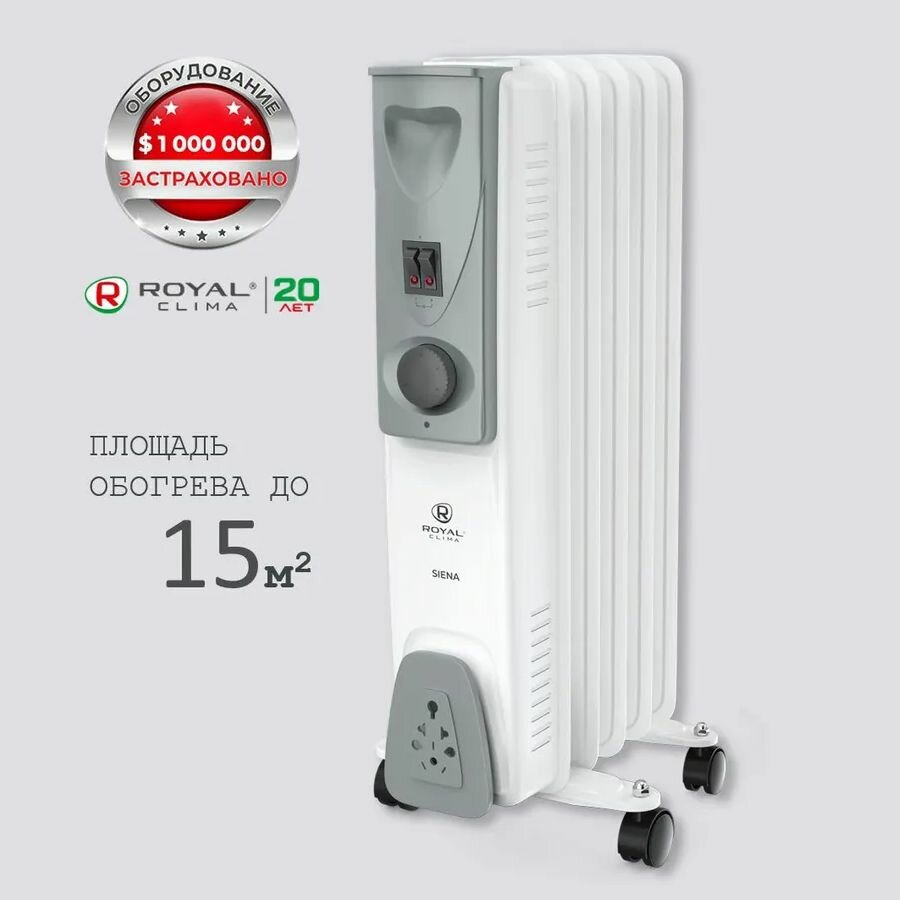 | Прочие особенности и свойства | 7-секционный масляный радиатор Royal Clima ROR-C7-1500M подойдет для использования как дома, так и на работе. В ходе работы прибора вы не почувствуете запаха. Радиатор также не производит шума: это свойство дает возможность разместить устройство в непосредственной близости от спального места. Вы сможете пользоваться 3 режимами нагрева: мягким, средним и интенсивным. Радиатор оборудован регулируемым термостатом, с помощью которого устройство может автоматически поддерживать заданную температуру., Радиатор Royal Clima ROR-C7-1500M сравнительно экономичен |