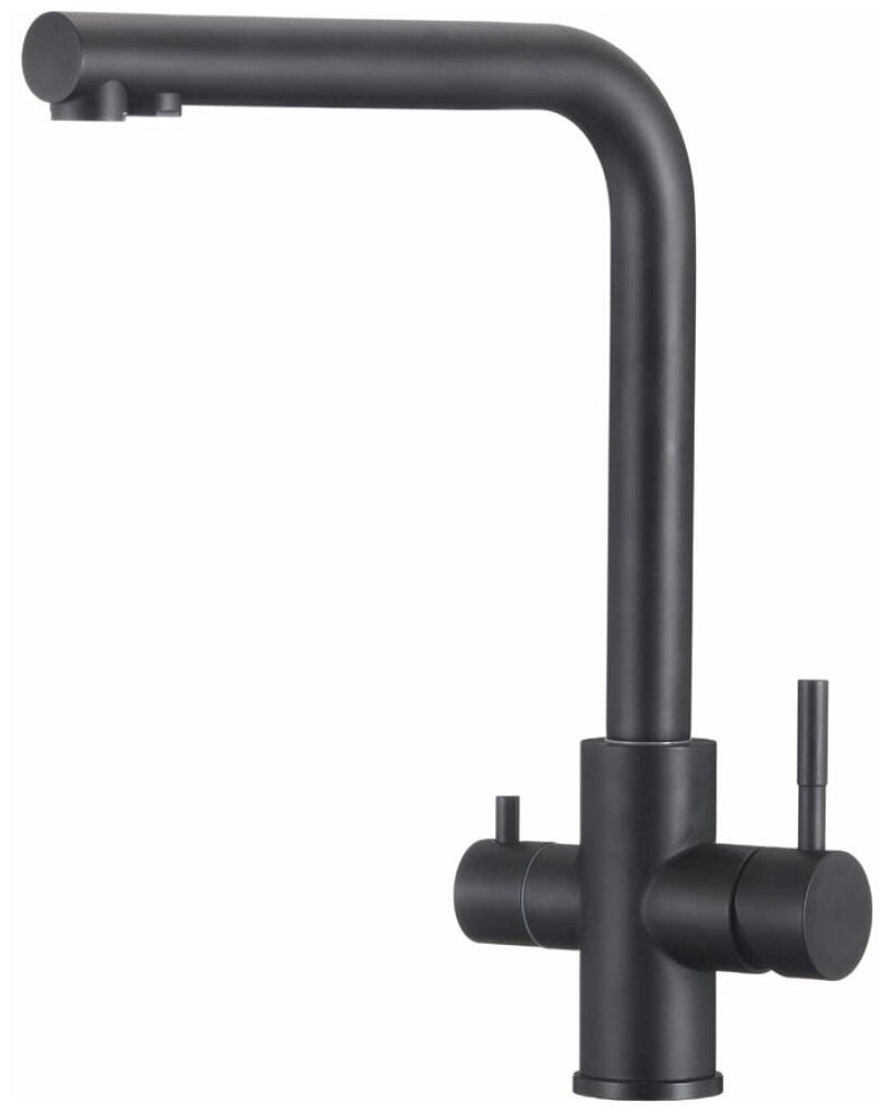 Смеситель для кухни Olives Balear 13450BLB. Характеристики: Цвет: черный матовый. Материал: нержавеющая сталь. Механизм: керамический картридж Silent Olives 35 мм. Управление: однорычажное. Излив: поворотный. Канал для фильтрованной воды. Пластиковый аэратор Eco Olives - снижение расхода воды до 9 л/мин. Аэратор для канала фильтрованной воды. Отверстий для монтажа: 1. Стандарт подводки: 1/2. Монтаж: на мойку. В комплекте поставки: Смеситель. Гибкая подводка 60 cм. Комплект креплений Fast Fix.