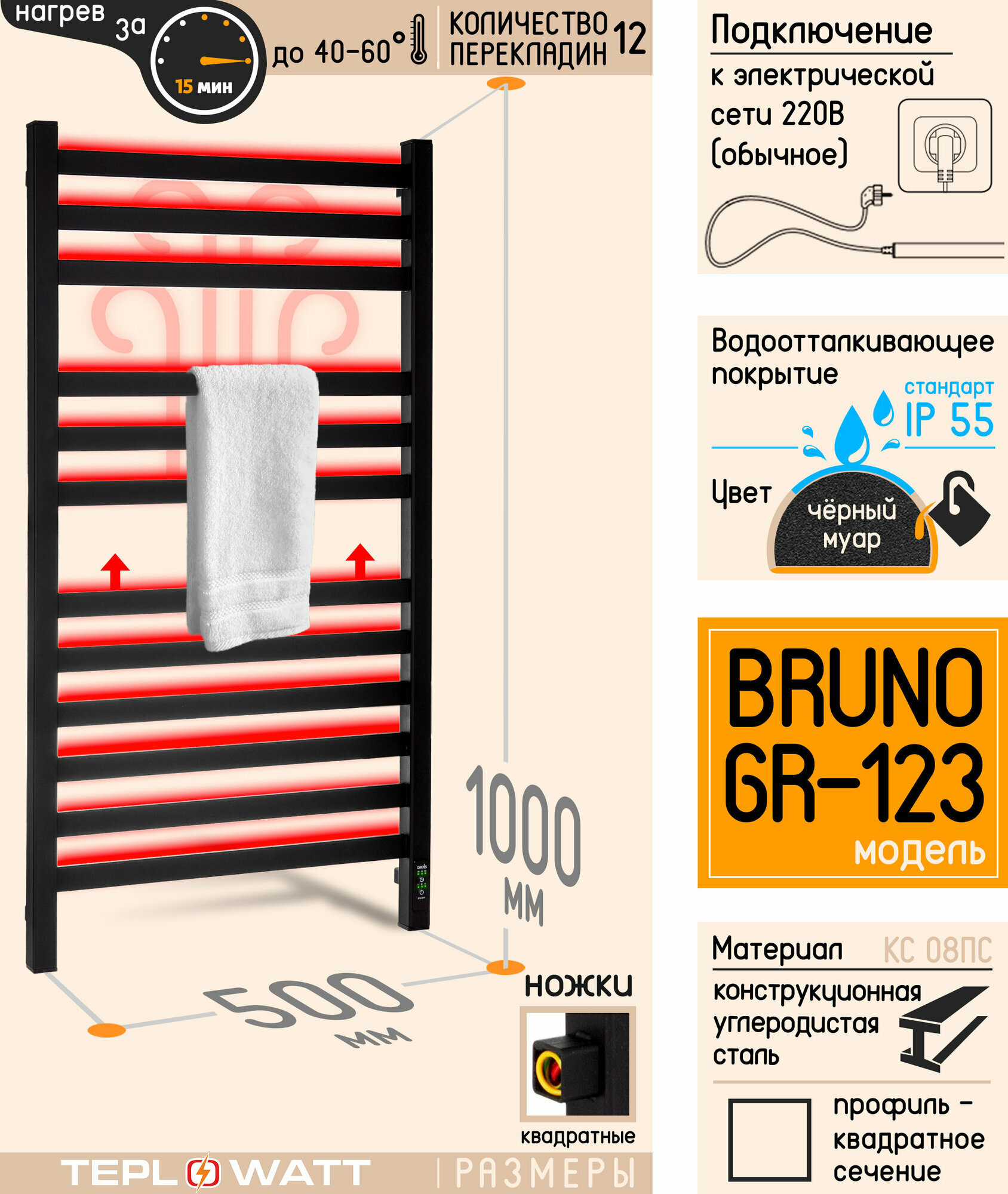 Полотенцесушитель электрический Grois Bruno 123 50х100 черный (GR-123 50/100 П12 9005 U)