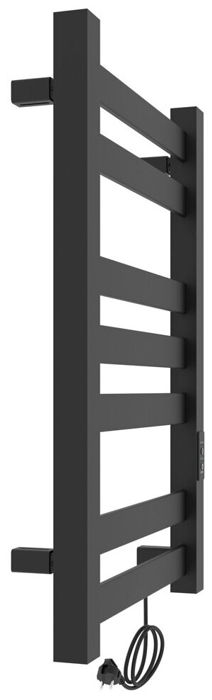 Полотенцесушитель электрический Laris Гефест ЧКЧ П7 500х800 черный матовый муар с терморегулятором и таймером имеет современный дизайн и прочную конструкцию. Материал сталь черная. Напряжение питания 220 В. Частота тока 50 Гц. Температура поверхности изделия 55. Размещение терморегулятора на стойке полотенцесушителя. Проверка на пробой изоляции производится напряжением в 1500В. Размещение шнура справа. Диаметр и толщина: стойка 45х45, толщина 1,5 мм; перемычка профиль 50х10, толщина 1,5 мм. Отступ от стены - 40 мм. Расстояние между центрами крепления 500 мм. Теплоноситель - греющий кабель. Площадь обогреваемого помещения 4 м2. Время нагрева до 10 минут. Оснащение: нагревательный кабель. Цвет черный матовый структура покрытия муар. Комплектация: Полотенцесушитель - 1 шт., модуль скрытого монтажа - 1 шт., набор крепления к стене (шуруп оцинкованный с дюбелем, пятак, втулка, штифт, стойка) - 4 шт., шестигранный ключ - 1 шт., паспорт изделия - 1 шт., гарантийный талон - 1 шт., транспортировочный чехол - 1 шт., картонная упаковка для защиты от повреждения при транспортировке - 1 шт.