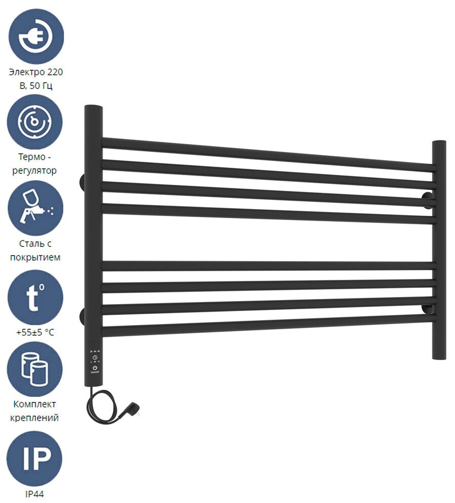 Полотенцесушитель электрический Laris Оливия ЧКЧ8 800х500 Э черный матовый муар с терморегулятором и таймером имеет современный дизайн и прочную конструкцию. Материал сталь черная. Напряжение питания 220 В. Частота тока 50 Гц. Температура поверхности изделия 55. Размещение терморегулятора на стойке полотенцесушителя. Проверка на пробой изоляции производится напряжением в 1500В. Размещение шнура слева. Диаметр и толщина: стойка Ø32, толщина 1,5 мм; перемычка профиль Ø20, толщина 1,5 мм. Отступ от стены - 40 мм. Расстояние между центрами крепления 800 мм. Теплоноситель - греющий кабель. Площадь обогреваемого помещения 6 м2. Время нагрева до 10 минут. Вес - 5 кг. Оснащение: нагревательный кабель. Цвет черный матовый. Структура покрытия муар. У полотенцесушителя есть возможность скрытого подключения. Модуль скрытого монтажа в комплекте.