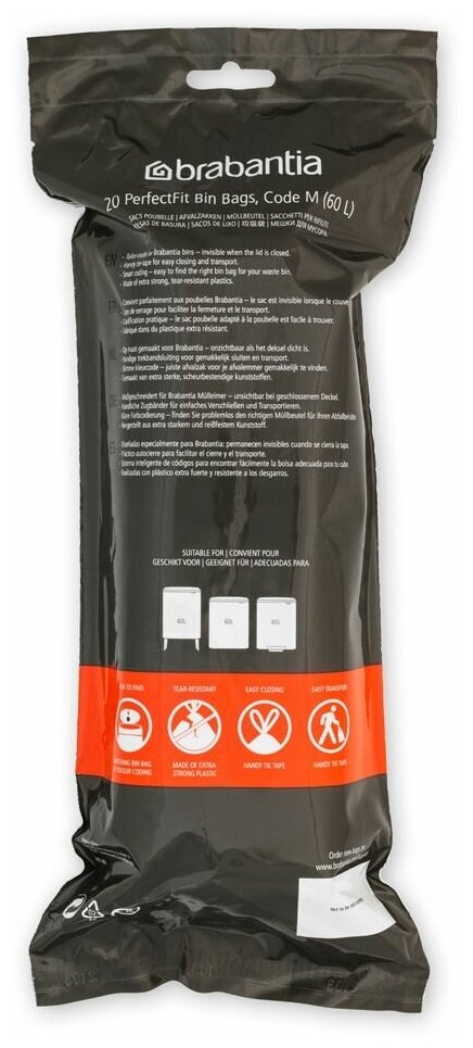 Удобно и быстро вкладываются и достаются из бака. Эстетичный вид – идеально подходят по размеру к мусорным бакам Brabantia, мешок не выступает наружу. Уникальная цветовая маркировка позволяет выбрать мешки нужного размера. Вентиляционные отверстия для удобства вкладывания в бак. Изготовлены из особо прочного полиэтилена (HDPE). Легко затягиваются и переносятся – специальная лента для стягивания горловины. Упаковка: 20 мешков в рулоне.