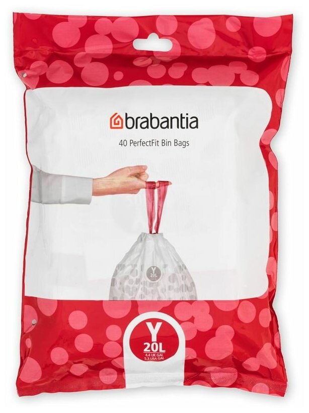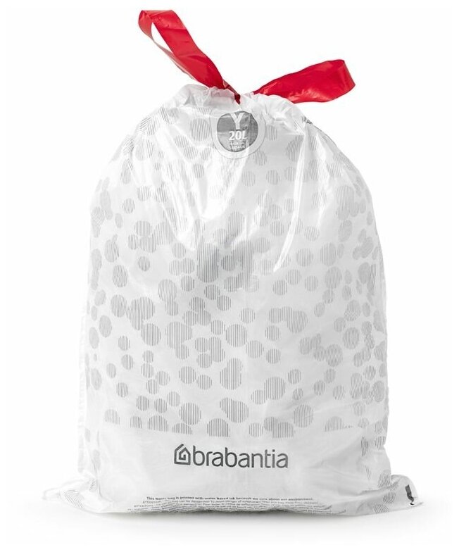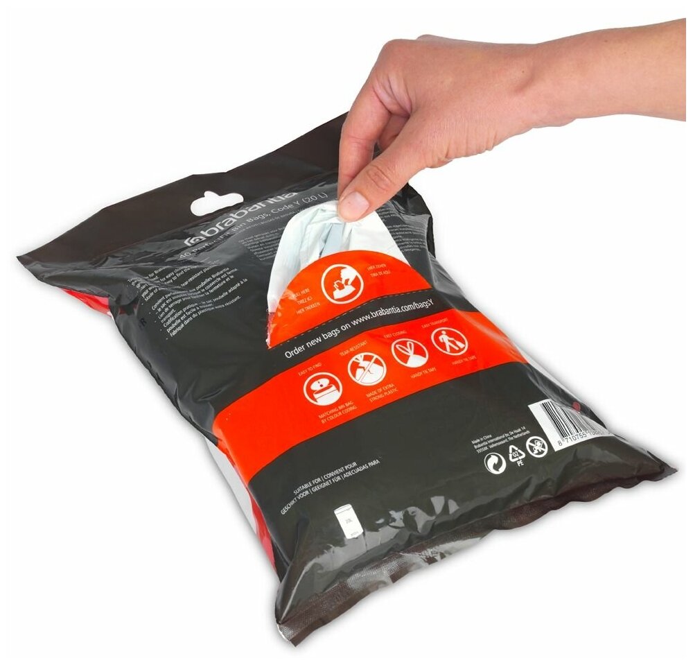 Удобно и быстро вкладываются и достаются из бака. Эстетичный вид – идеально подходят по размеру к мусорным бакам Brabantia, мешок не выступает наружу. Уникальная цветовая маркировка позволяет выбрать мешки нужного размера. Вентиляционные отверстия для удобства вкладывания в бак. Изготовлены из особо прочного полиэтилена (HDPE). Легко затягиваются и переносятся – специальная лента для стягивания горловины. Упаковка-диспенсер: 40 мешков.