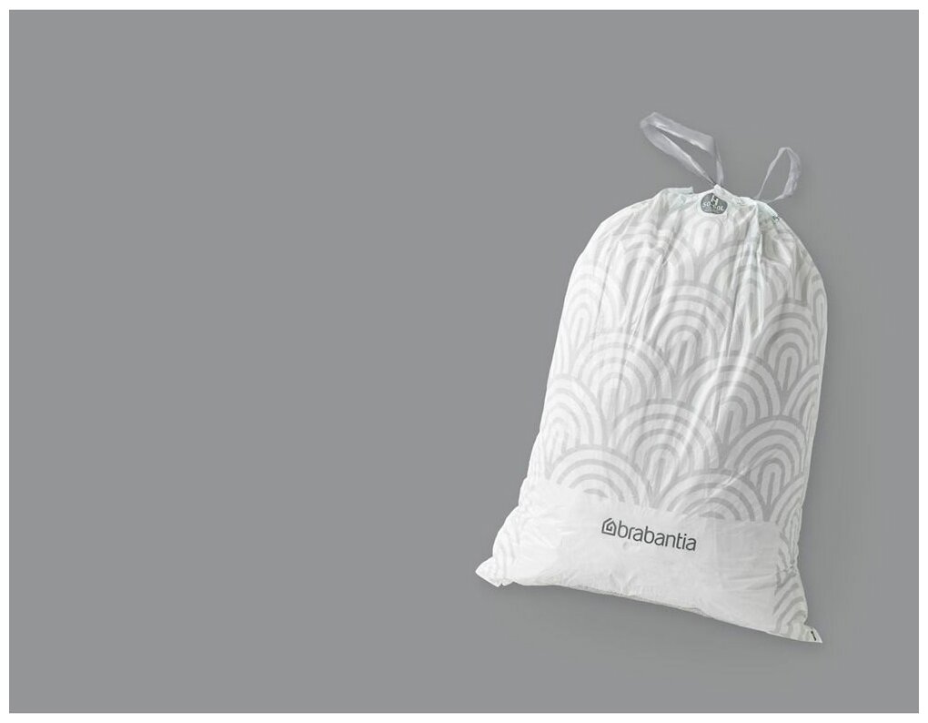 Удобно и быстро вкладываются и достаются из бака. Эстетичный вид – идеально подходят по размеру к мусорным бакам Brabantia, мешок не выступает наружу. Уникальная цветовая маркировка позволяет выбрать мешки нужного размера. Вентиляционные отверстия для удобства вкладывания в бак. Изготовлены из особо прочного полиэтилена (HDPE). Легко затягиваются и переносятся – специальная лента для стягивания горловины. Упаковка-диспенсер: 40 мешков.