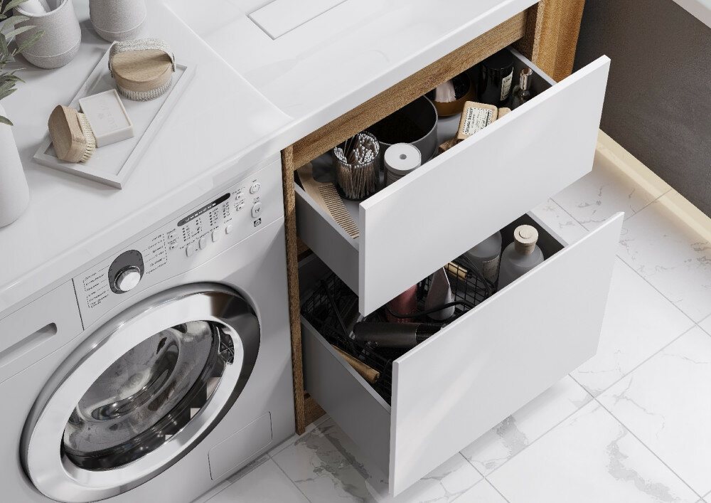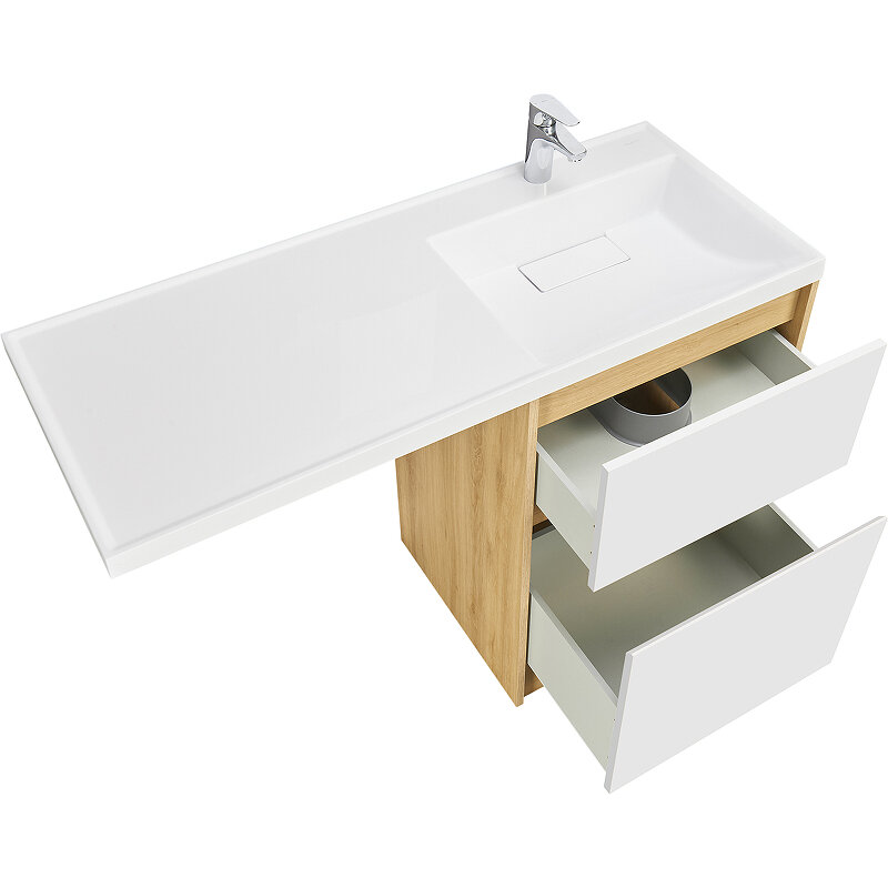 Тумба Лондри под стиральную машину выполнена из влагостойкой ламинированной плиты в древесной отделке. Корпус тумбы и фасад приобретаются отдельно. Тумбы комплектуются фасадами как с такой же древесной текстурой, так и в универсальном белом глянцевом цвете ; это позволяет выбрать модель тумбы в соответствии с личными предпочтениями, создав наиболее удачное решение для конкретного интерьера ванной комнаты. Более того, при желании в одной тумбе можно совместить корпус и фасады в двух разных по оттенку древесных декорах. Верхний ящик открывается с помощью системы push-to-open, а нижний - за фасад с помощью удобного выпила под углом. Ящики выдерживают нагрузку до 25 кг. Тумба установлена на регулируемые опоры, которые находятся за цоколем. Тумба комплектуется раковиной Лондри 120 из прочного литого мрамора, который устойчив к воздействию химических средств. Широкое крыло раковины обеспечивает ванную комнату дополнительным функциональным пространством. Дополнительно к тумбе можно приобрести шкаф-колонну Лондри и зеркальный шкаф Лондри 120.