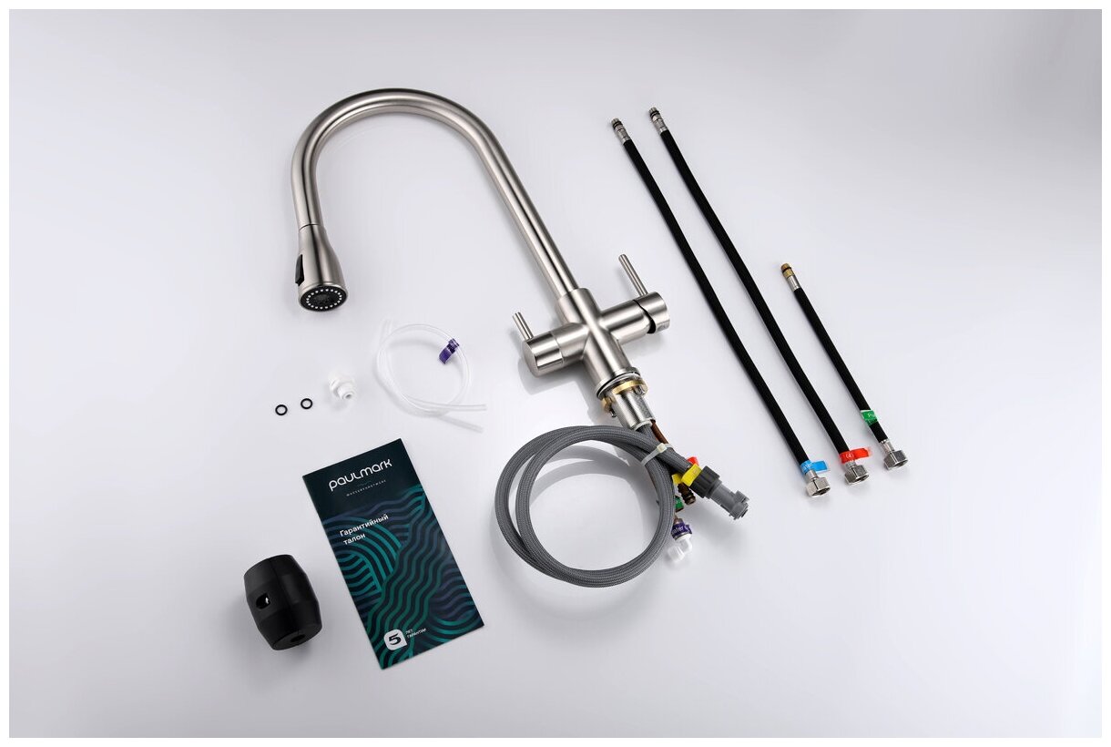 | Оснащение | аэратор, гибкая подводка, крепления, ручной выдвижной душ |