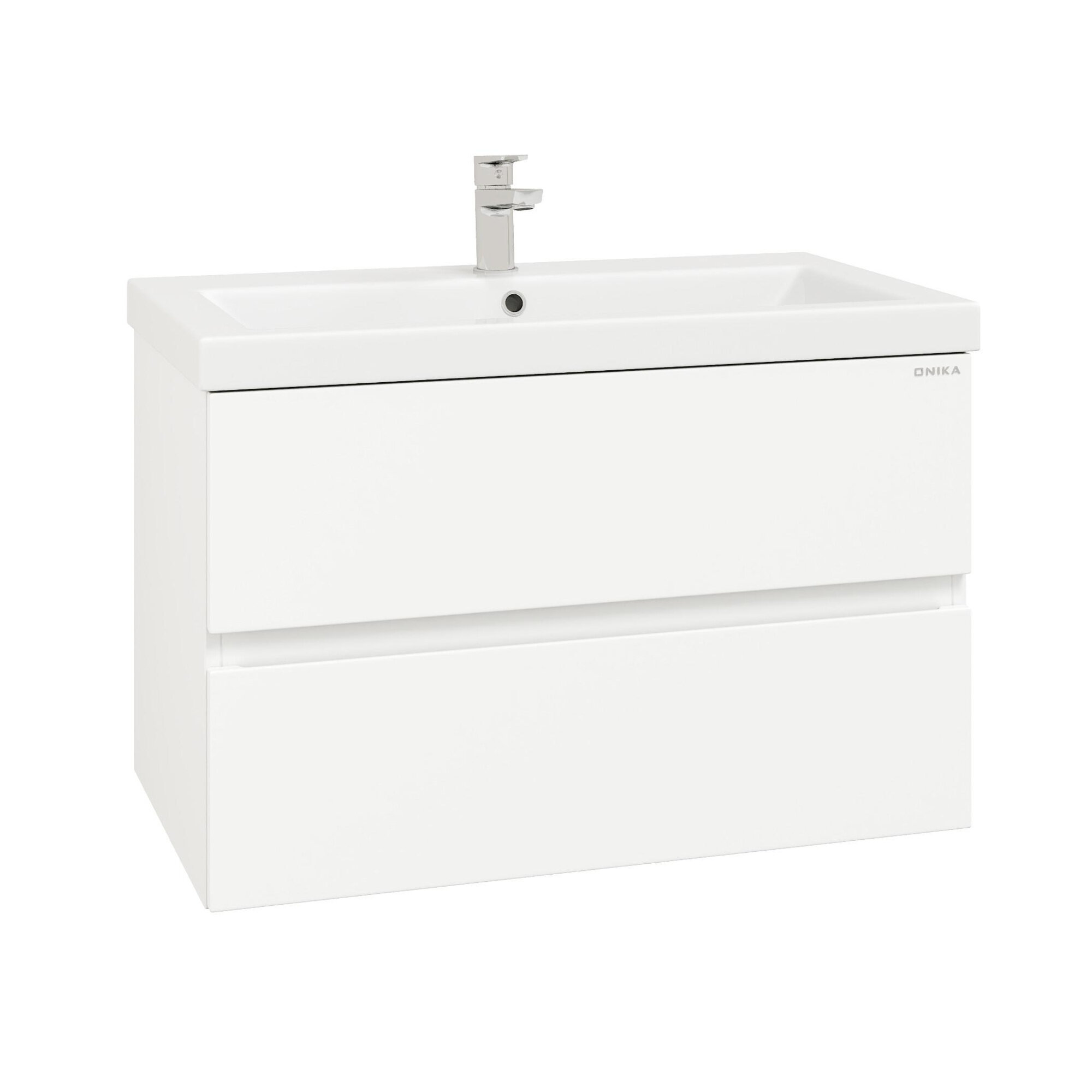 Подвесная тумба для ванной комнаты Onika Эвада 80 сочетает в себе стильный минималистичный дизайн, белую глянцевую поверхность и высочайшее качество исполнения. Два вместительных ящика с направляющими скрытого монтажа с доводчиками помогут организовать пространство в ванной комнате и компактно разместить необходимые вещи. Подвесная конструкция значительно упрощает процесс уборки в ванной комнате, а ручки, изящно интегрированные в фасады, позволяют сделать эксплуатацию более удобной и практичной. Тумба выполнена из лмдф и ЛДСП, покрытых эмалью, устойчивой к механическим воздействиям, перепадам температур и высокой влажности. Подвесы для крепления тумбы - в комплекте. Размеры тумбы без учета раковины 78x44x50 cм. Гарантия на изделие 2 года. Совместимая раковина - Cersanit Como-80.