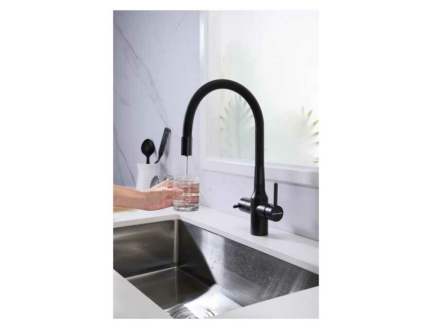 СуперПокупка.Ру представляет смеситель Salix - удобный и функциональный выбор для вашей кухни. Благодаря гибкому изливу с фиксацией, вы сможете регулировать направление потока воды в любом удобном положении. Кроме того, смеситель оснащен отдельным каналом для питьевой воды, который позволяет избежать смешивания с водопроводной водой. Для обеспечения максимального комфорта использования, излив обеспечивает оптимальный диапазон движения, а ручка открытия питьевой воды и отдельное управление потоком позволяют легко контролировать расход воды. Высокий поворотный излив с вращением на 360° обеспечивает максимальную гибкость при использовании смесителя. Смеситель Salix также имеет возможность подключения системы фильтрации питьевой воды, что делает его отличным выбором для тех, кто заботится о качестве воды, которую они употребляют. Монтаж смесителя универсальный, что позволяет установить его на мойку или на столешницу. Изготовленный из качественных материалов, таких как латунь и силикон, смеситель Salix является надежным и прочным. Продукт поставляется в комплекте с необходимыми аксессуарами, включая гибкую подводку длиной 40 см, усиленный комплект крепления, выход для подключения системы фильтрации воды, переходник цанга 1/2" для подключения фильтра и индивидуальную сберегающую упаковку с ложементом из поролона. Характеристики смесителя Salix : • Гибкий излив с фиксацией. Оптимальный диапазон движения излива. • Отдельный канал для питьевой воды, что предотвращает смешивание питьевой и водопроводной воды. • Ручка открытия питьевой воды, отдельное управление открытием потока питьевой воды. • Высокий поворотный излив, вращение на 360°. • Возможность подключения фильтра питьевой воды. • Универсальный монтаж на мойку или на столешницу. • Материал изготовления: латунь и силикон. • Гарантия на продукт составляет 5 лет. Комплектация включает в себя: • Гибкую подводку длиной 40 см из нержавеющей стали с гайками G1/2". • Усиленный комплект крепления. • Выход для подключения системы фильтрации воды. • Переходник цанга 1/2" для подключения фильтра. • Индивидуальную сберегающую упаковку с ложементом из поролона. Не упустите возможность приобрести качественный и удобный смеситель для вашей кухни на СберМегаМаркете!