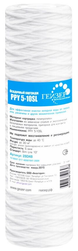 Модель: Картридж Гейзер PPY 25-20SL 28080 механический, 25мкм, полипропилен, ХВС