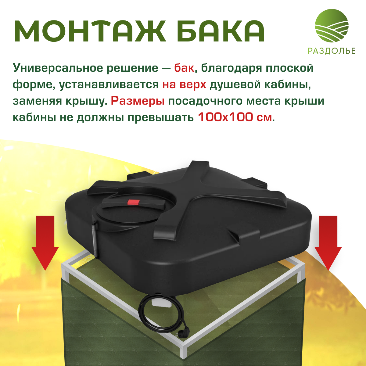 Баки для дачной душевой кабины «Rostok»– это простые, легко транспортируемые емкости из полиэтилена. Они предназначены для использования в уличных условиях. Их удобная конструкция отлично подходит для комплектации самостоятельно построенных летних душевых кабин.