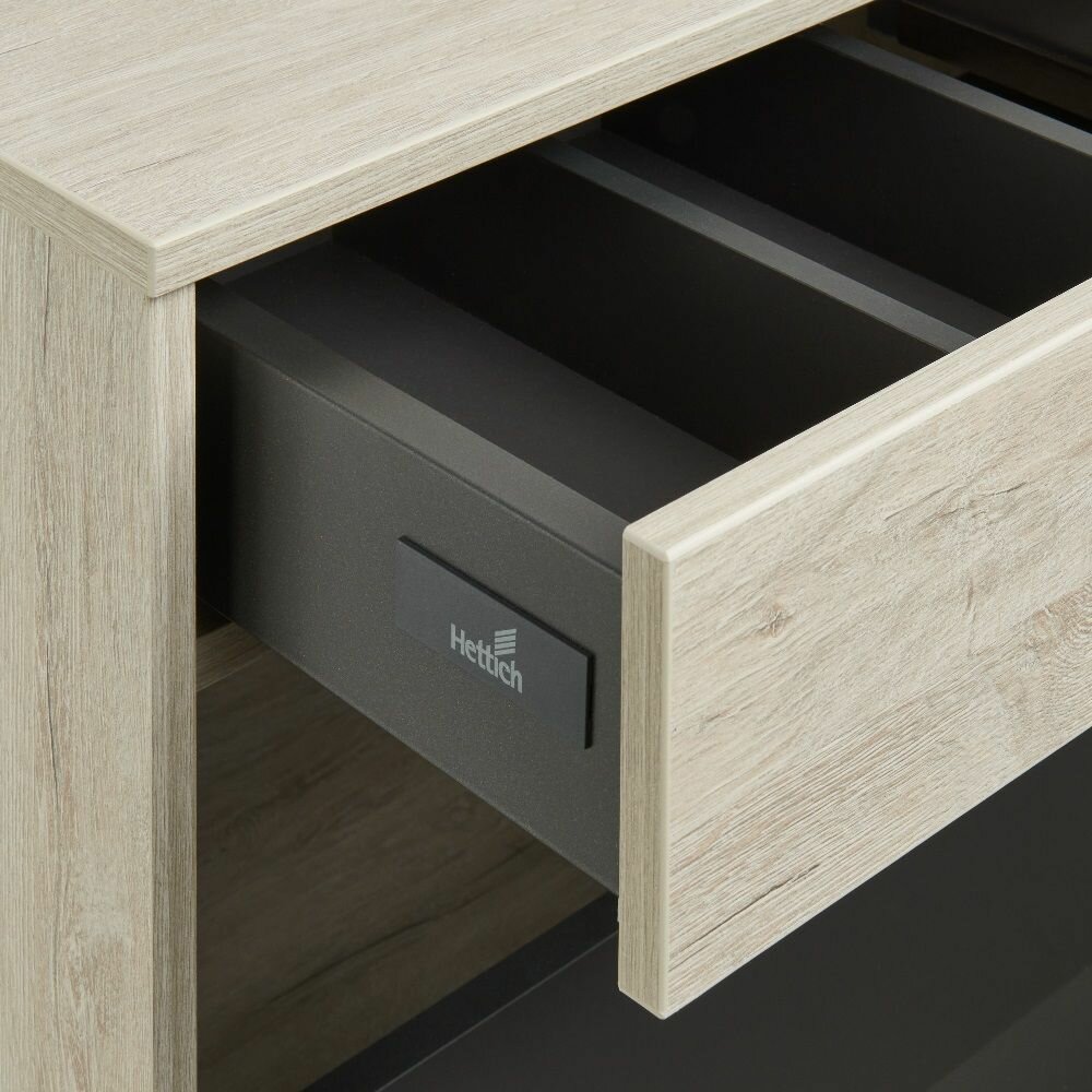 Модуль 80 коллекции Лофт Урбан функционально состоит из двух ящиков полного выдвижения. Верхний ящик тумбы комплектуется внутренней организацией пространства: в нем очень удобно хранить небольшие аксессуары и принадлежности. Вместительный нижний высокий ящик подойдет для более крупных предметов. Функция полного выдвижения ящиков и система открывания push-to-open делают использование тумбы особенно комфортным. Подвесной модуль может комплектоваться различными по размеру и дизайну металлическими черными опорами, высокими и низкими, которые крепятся непосредственно под модуль, кроме того, доступен вариант установки модуля и без опор. Корпус тумбы выполнен из влагостойкой ламинированной ДСП в цвете дуб орегон с текстурой натурального дерева, выгодно подчеркнутым фасадами из МДФ в пленке антрацит с эффектом soft touch.