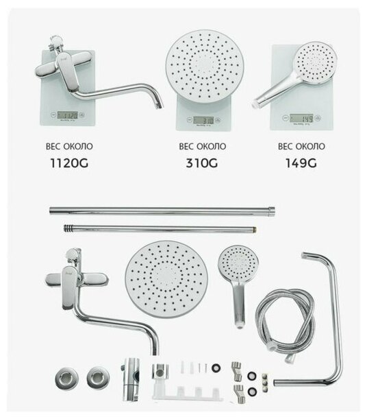 | ВКоробке | Душевая стойка - 1 шт. Верхний душ - 1 шт. Лейка - 1 шт. Шланг - 1 шт. Смеситель - 1 шт. Крючок - 1 шт. Эксцентрик - 2 шт. Инструкция - 1 шт. |