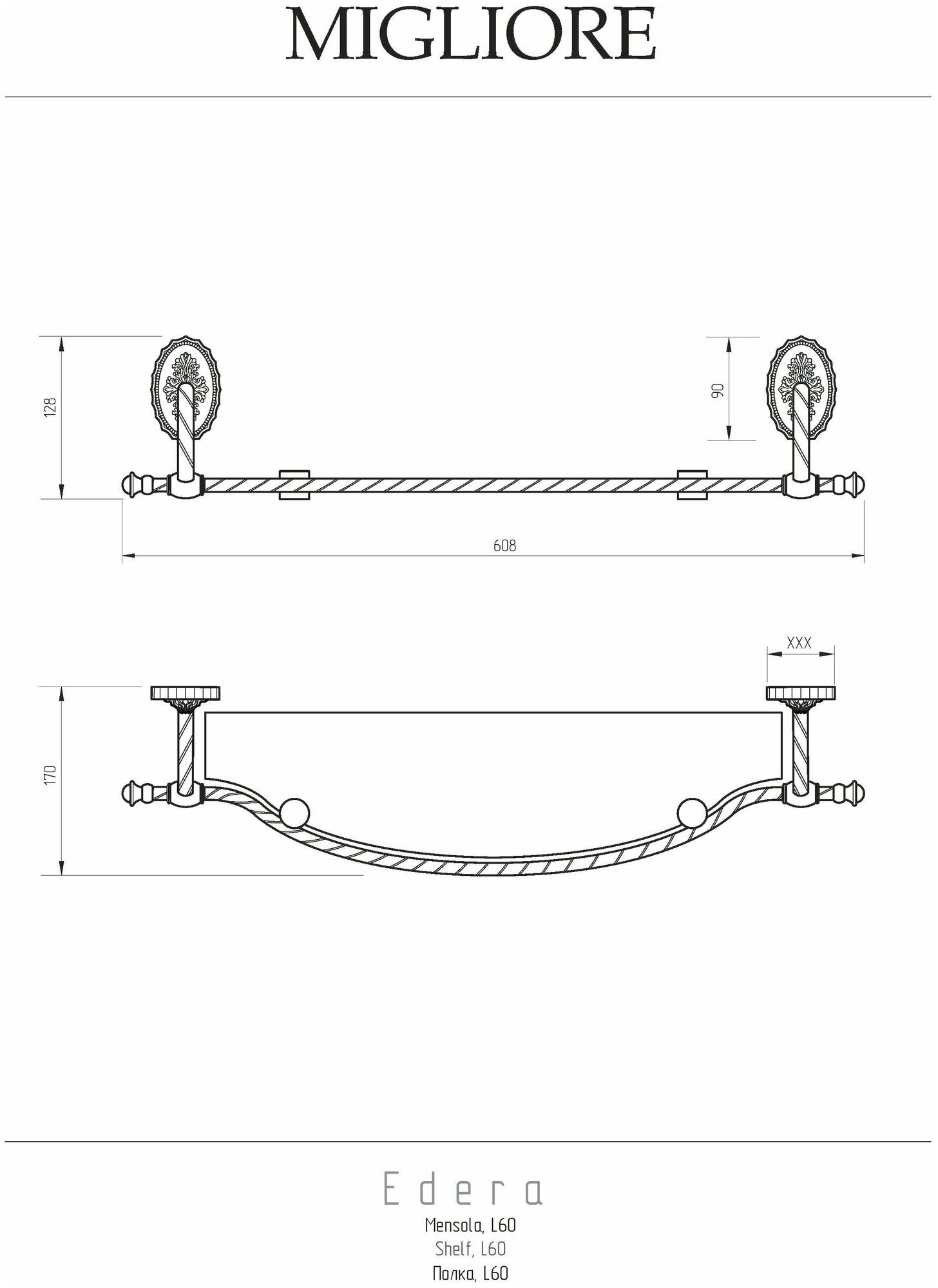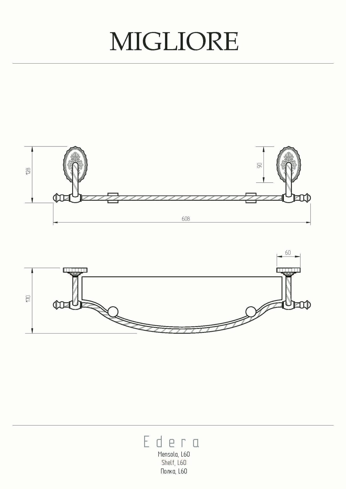 Полка с галереей коллекции EDERA бренда MIGLIORE длиной 65 см — это функциональный аксессуар для ванной комнаты в классическом стиле. Полка вешается над раковиной. На ней можно разместить все необходимые косметические средства, которые будут всегда у вас под рукой. Ограничительпо переднему краю полки не позволит упасть тюбикам и предметам. Благодаря витым элементам и необычной овальной розетке аксессуары коллекции EDERA будут смотреться элегантно и оригинально в классическом интерьере ванной комнаты. Материал — латунь, покрытие цвета бронза. Внимание: бронзовое покрытие достаточно деликатное и для ухода рекомендуется протирать изделие мягкой безворсовой тряпочкой с мыльным раствором и вытирать насухо или использовать чистящее средство бренда MIGLIORE для смесителей и аксессуаров с деликатными покрытиями бронза, золото, медь. Материал: Латунь+стекло Оснащение: крепления (шурупы)