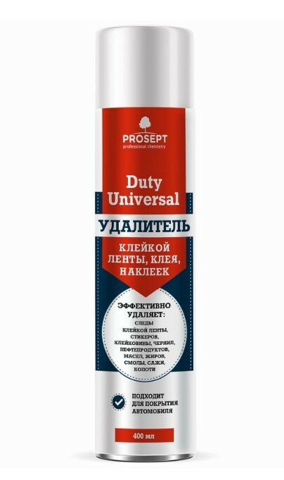 Чистящий аэрозоль PROSEPT Duty Universal предназначен для удаления следов клея, клейкой ленты, клейковины, маркеров, чернил, масляных и жировых пятен, смолы, сажи, копоти и прочих загрязнений.Растворяет клеевую основу этикеток, наклеек, стикеров. Применяется для очистки устойчивых к органическим растворителям материалов.Подходит для очистки ПВХ-плитки, ламината, лакированных и окрашенных поверхностей.Также подходит для автомобиля и не повреждает лакокрасочное покрытие. Не применять для латекса, прорезиненных поверхностей и полиэтилена.