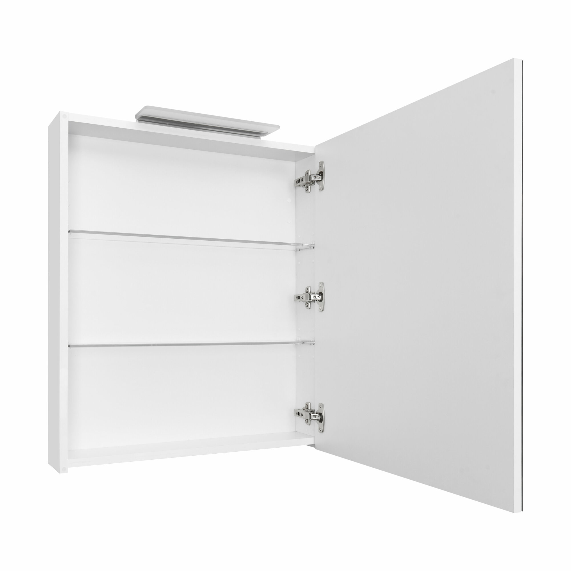 Зеркальный шкаф Oleta оснащен светильником от европейского бренда Ebir с возможностью регулировки положения, IP 44, 5 700 K. Теплота света у светильника 5 700 K - это яркий свет, идеальный для нанесения макияжа и бритья. Положение светильника можно регулировать: наклонить слегка вниз или направить свет повыше. За зеркальными фасадами расположены регулируемые по высоте полочки из просветленного стекла. Фасады оснащены петлями Hettich с плавным закрыванием.