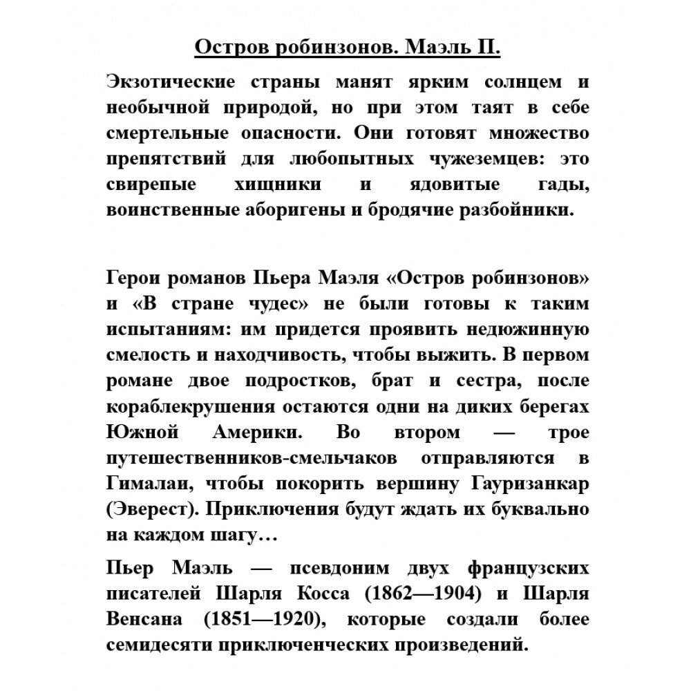 Герои романов Пьера Маэля "Остров робинзонов" и "В стране чудес" не были готовы к таким испытаниям: им придется проявить недюжинную смелость и находчивость, чтобы выжить. В первом романе двое подростков, брат и сестра, после кораблекрушения остаются одни на диких берегах Южной Америки. Во втором - трое путешественников-смельчаков отправляются в Гималаи, чтобы покорить вершину Гауризанкар (Эверест). Приключения будут ждать их буквально на каждом шагу…