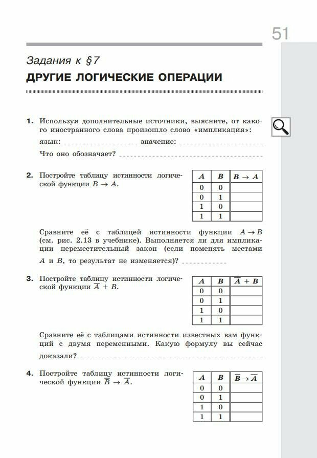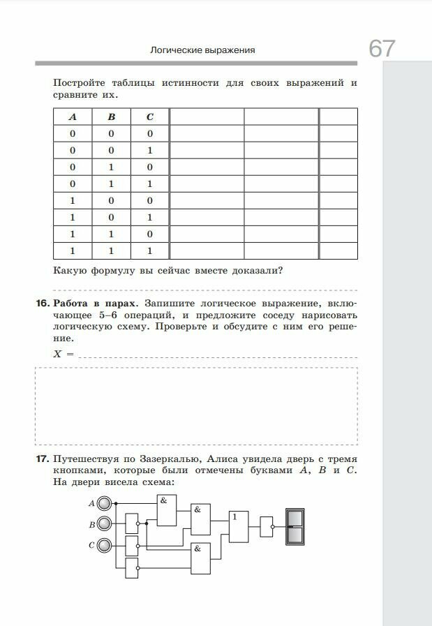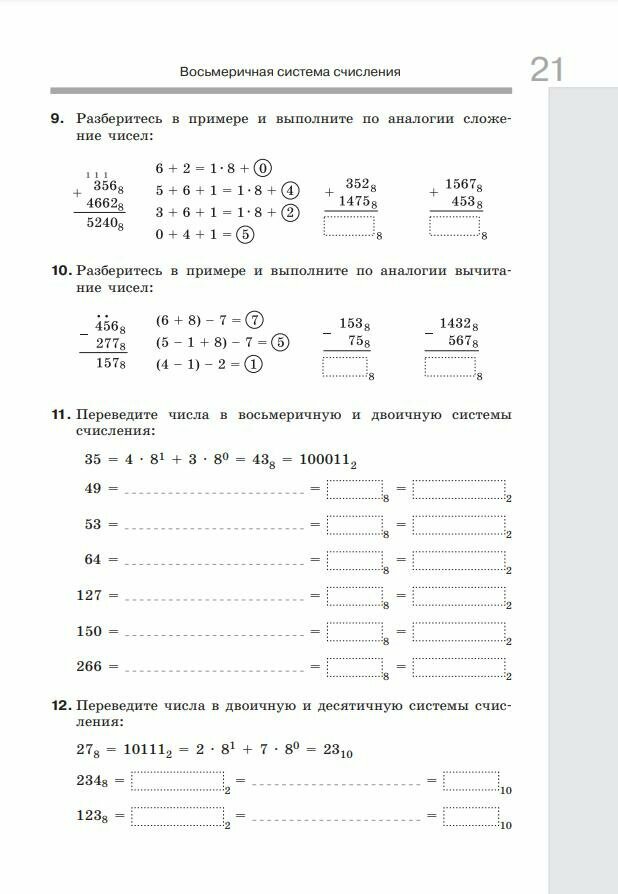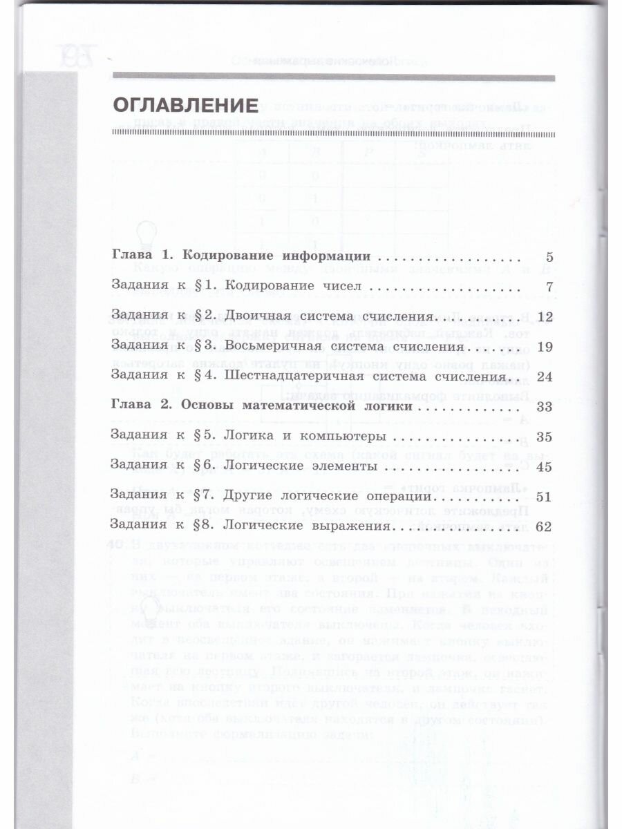 В рабочей тетради для каждого параграфа подобраны задания, которые можно выполнять как на уроке, так и дома. Рабочая тетрадь содержит задания по всем темам пособия. В первой части рабочей тетради представлены задания по темам "Кодирование информации" и "Основы математической логики" пособия, во второй - "Алгоритмы и программирование" и "Программирование".