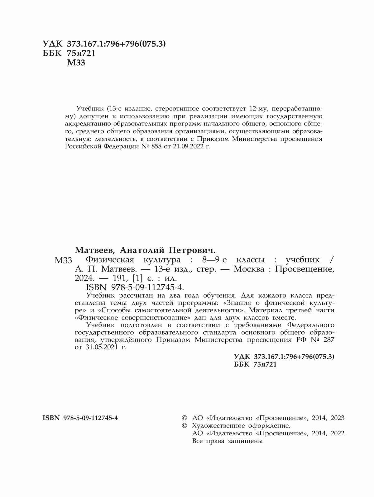 Физическая культура. 8-9 классы. Учебник. ФГОС (Матвеев Анатолий Петрович); Просвещение Издательство, 2023