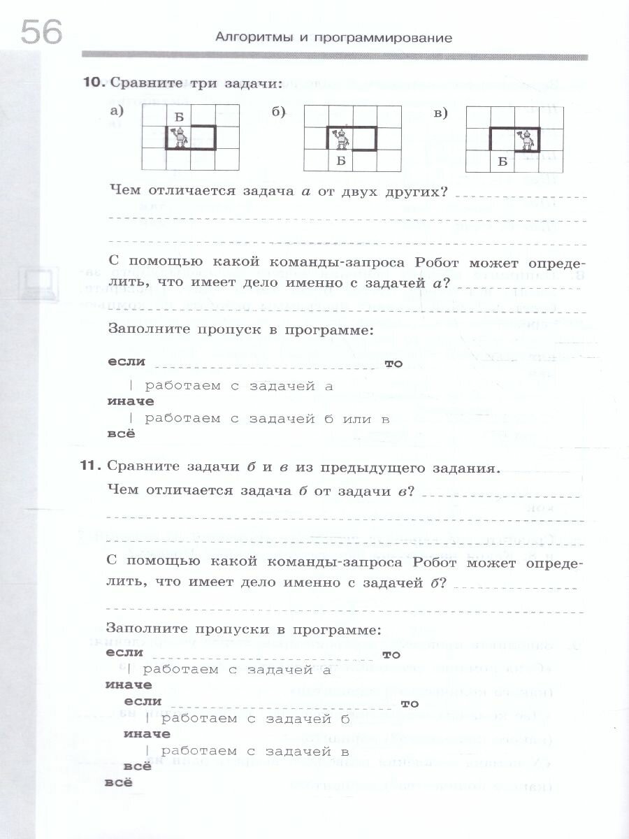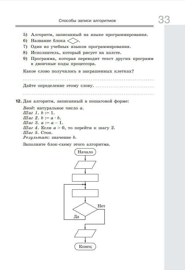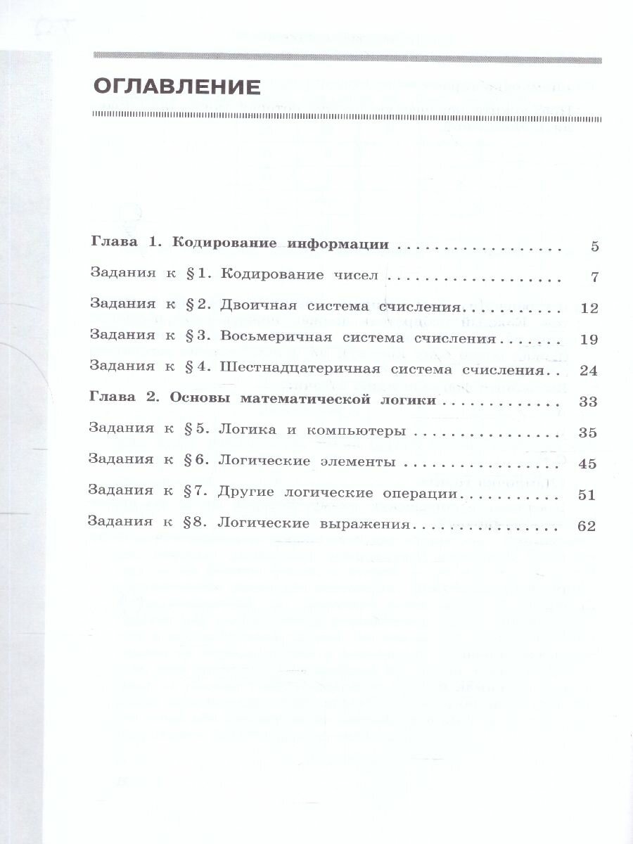 В рабочей тетради для каждого параграфа подобраны задания, которые можно выполнять как на уроке, так и дома. Рабочая тетрадь содержит задания по всем темам пособия. В первой части рабочей тетради представлены задания по темам "Кодирование информации" и "Основы математической логики" пособия, во второй - "Алгоритмы и программирование" и "Программирование".