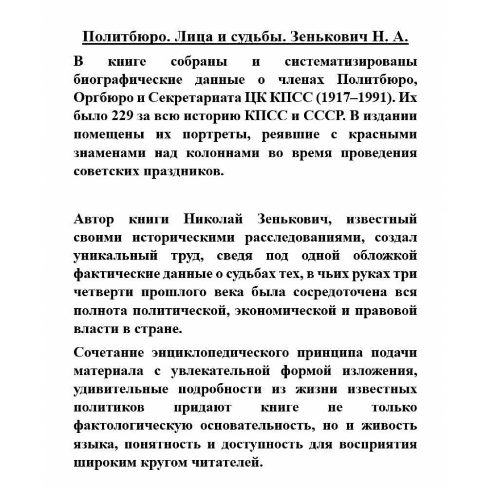 Автор книги Николай Зенькович, известный своими историческими расследованиями, создал уникальный труд, сведя под одной обложкой фактические данные о судьбах тех, в чьих руках три четверти прошлого века была сосредоточена вся полнота политической, экономической и правовой власти в стране.