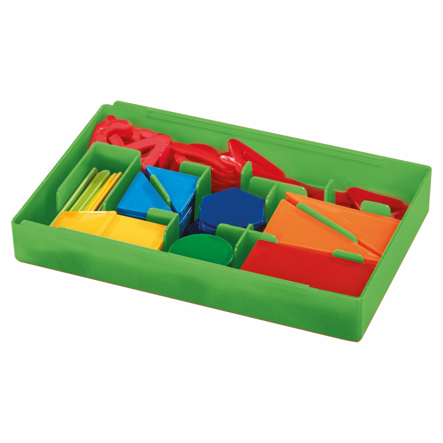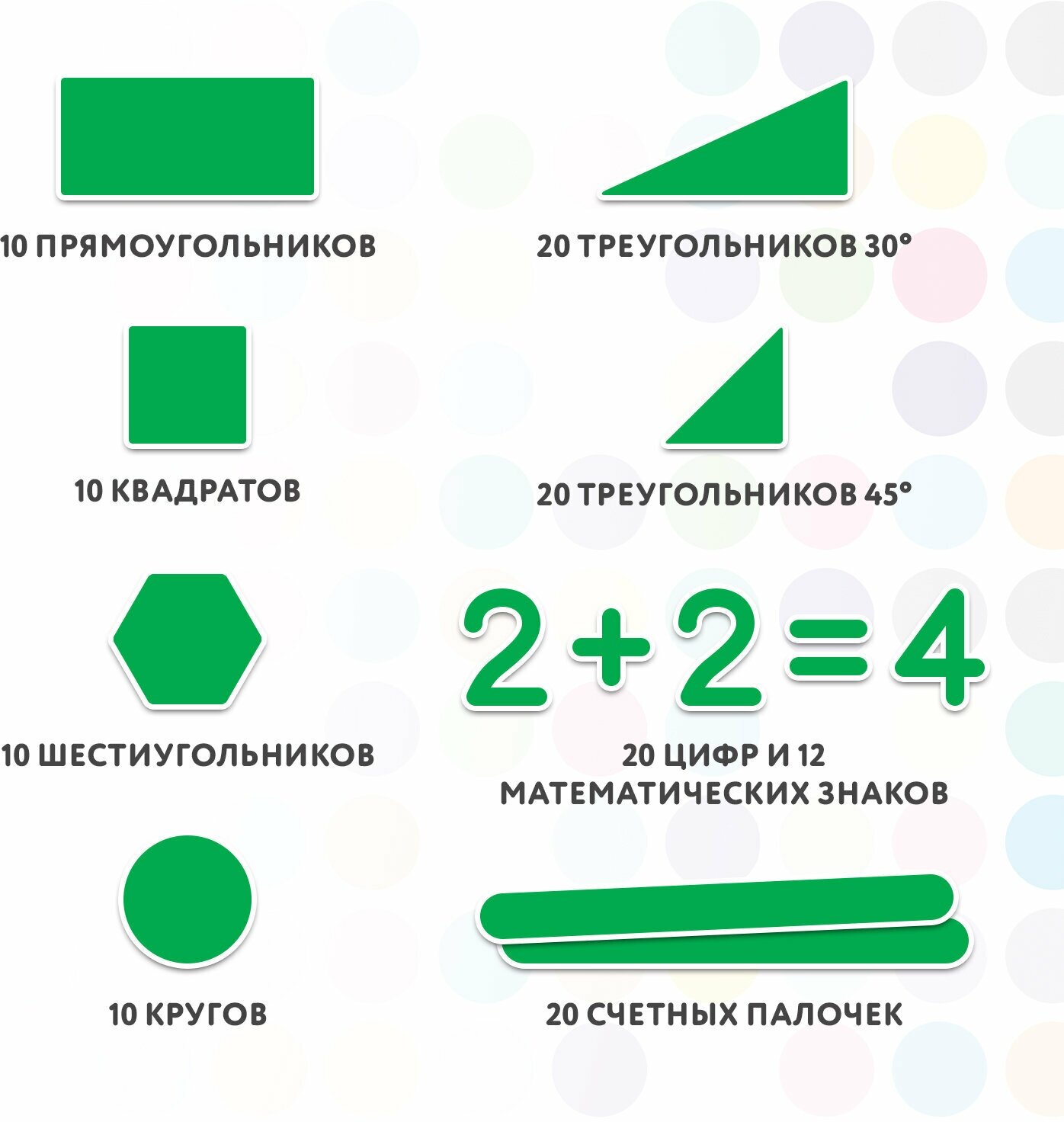 Комплектация: геометрические фигуры, математические знаки, счетные палочки, цифры