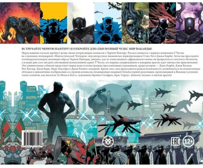Встречайте Т’Чаллу, Черную Пантеру, и удивительный мир Ваканды в великолепном артбуке Marvel! В книге собраны яркие иллюстрации разных эпох повествования о Пантере - начиная с его дебюта в "Фантастической Четверке" Стэна Ли и Джека Кирби, первого появления в команде Мстителей и заканчивая его статусом звезды сольных серий. Фантастические иллюстрации от таких художников как Джон Бусима, Рич Баклер, Джон Бирн, Марк Тексейра и Джон Ромита-младший! Обложки к комиксам о Черной Пантере Алекса Росса, Скотти Янга, Артура Адамса, Нила Адамса, Симоне Бьянки, Оливье Койпеля, Джо Джаско и многих других.