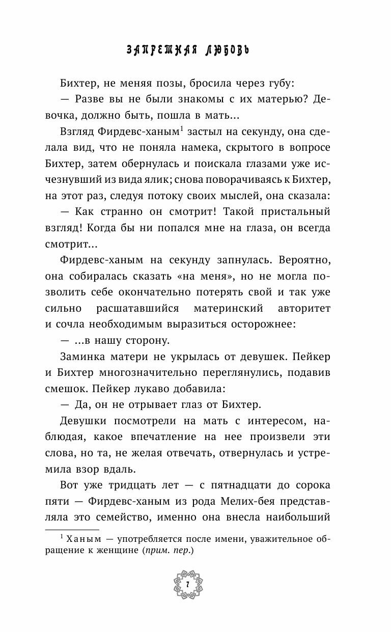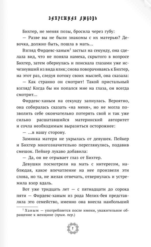 Сериал \"Запретная любовь\" смотрела еще до того, как турецкие сериалы стали так популярны, как сейчас. История любви и страданий Бихтер и Бехлюля не оставила меня равнодушной, во многом благодаря игре замечательной актрисы Берен Саат. Поэтому было любопытно познакомиться с первоисточником, тем более, что книга издается впервые на русском языке. Роман в целом понравился, но без предварительного знакомства с сериалом едва ли бы заинтересовал. \"Птичка певчая\", ввшедшая из-под пера другого турецкого писателя-Гюнтекина, показался мне гораздо живее и образнее. Не жалею о том, что познакомилась с литературной \"Запретной любовью\", но перечитывать не буду.