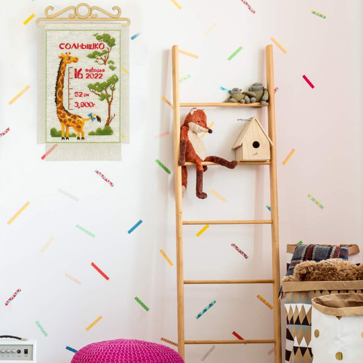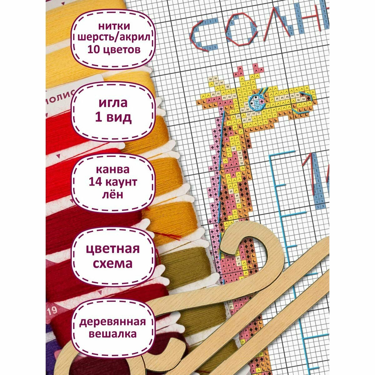 В наборе используются техники: крест, полукрест, стежок, смешанные цвета. В набор входит 1 деревянная вешалка.
