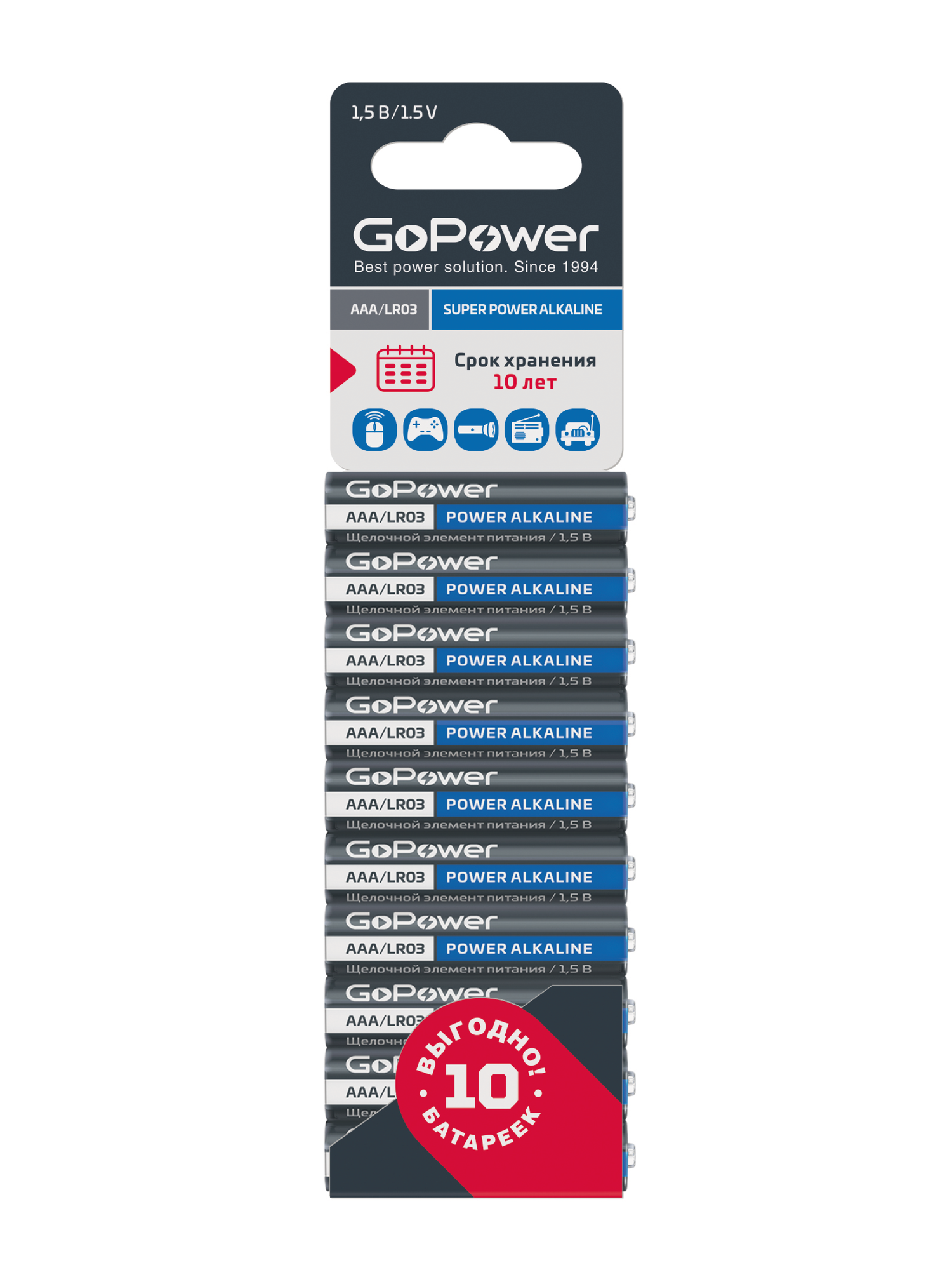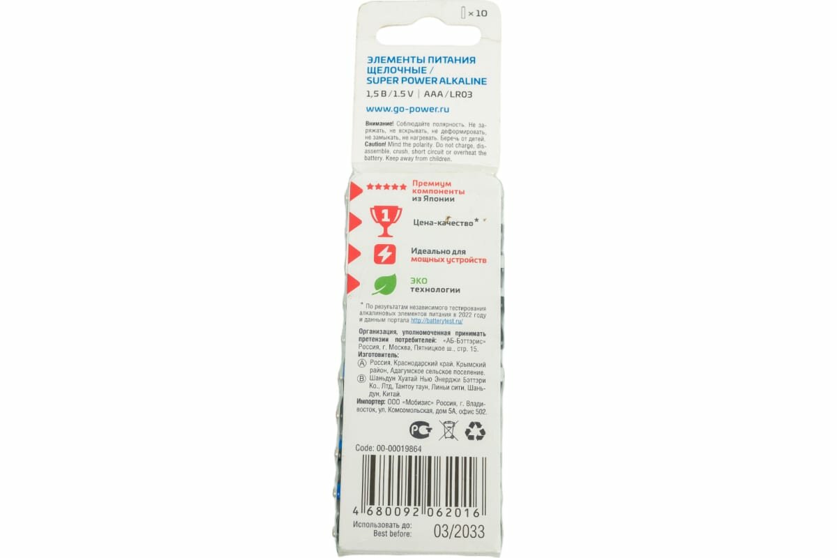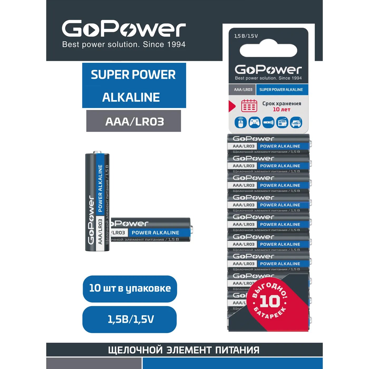 Щелочные батарейки GoPower 00-00019864 серии SUPER POWER ALKALINE универсального назначения, они идеально подходят для большинства современных устройств. Благодаря улучшенной формуле эти элементы питания работают дольше.