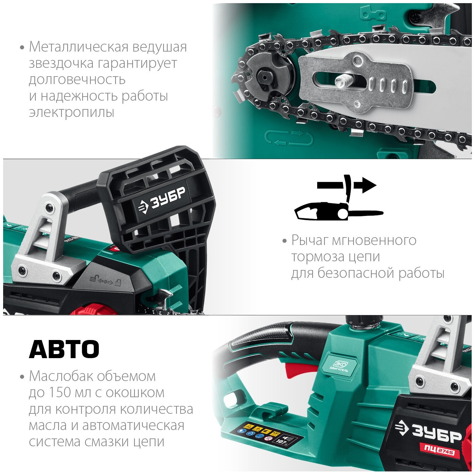 | Прочие особенности и свойства | Удобное и беспроблемное средство выполнения нужной работы,Легкая, эргономичная и удобная пила ЗУБР ПЦ-2745 с простой конструкцией, гарантирующей высокую надежность,Продольное расположение двигателя обеспечивает компактность и идеальную развесовку,Шина длиной 45 см позволяет распиливать заготовки большого диаметра,Основной тормоз мгновенного действия гарантирует высокую безопасность работы,Система быстрого натяжения полотна способствует ускорению работы и повышению производительности,Автоматическая система смазки цепи дозированно подает масло в зависимости от нагрузки,Термопредохранитель для защиты двигателя от перегрузки при тяжелой работе,Уловитель цепи и клавиша блокировки включения для дополнительной безопасности,Крючок фиксации удлинителя для исключения чрезмерного натяжения и внезапного отключения питающего провода |