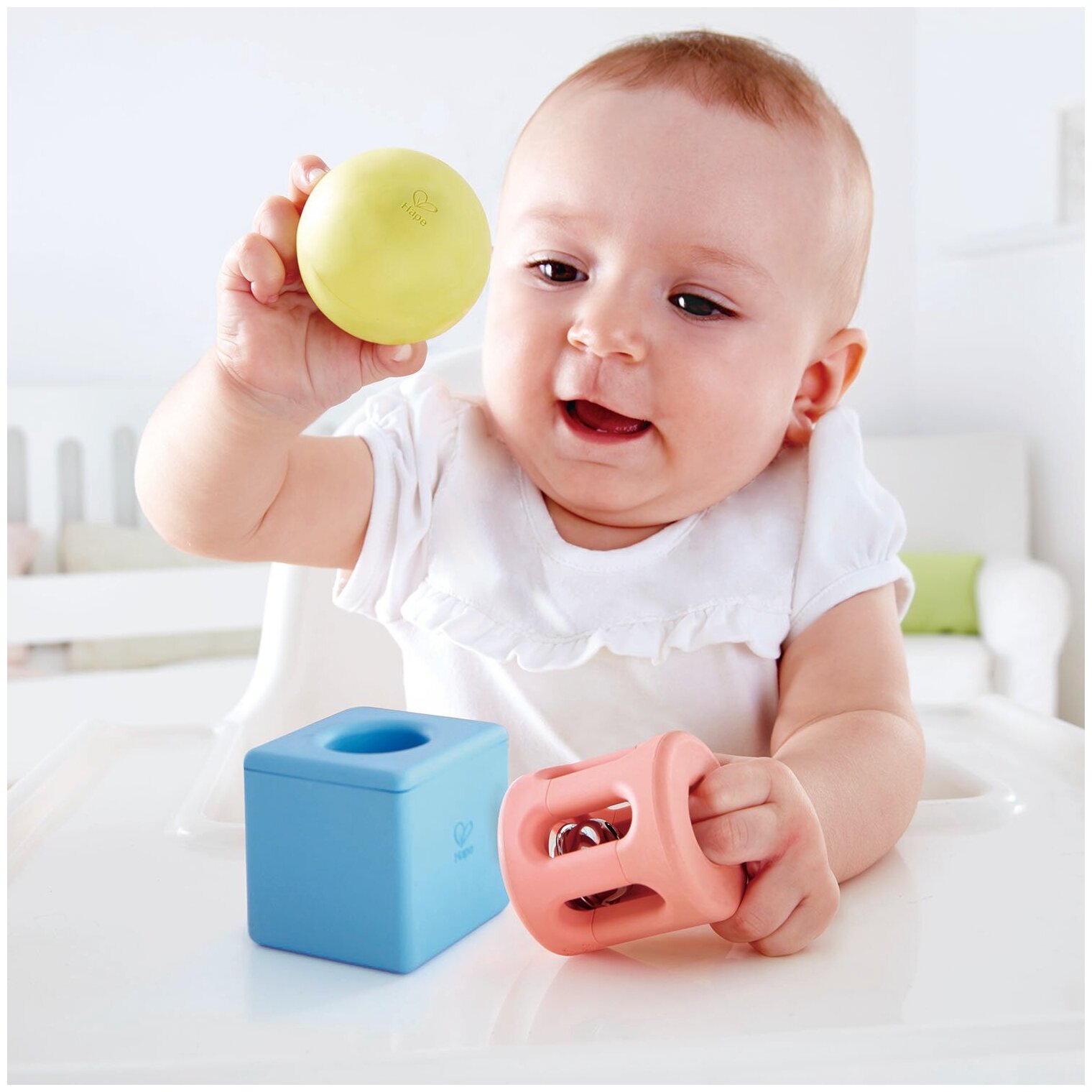 МЯЧ, ПОГРЕМУШКА И ЛИНЗА: желтый шарик с абсолютно радостным лицом содержит деревянную бусину, розовая цилиндрическая погремушка содержит колокольчик, который ваш ребенок, несомненно, будет использовать, чтобы издавать красивые звуки, а квадратная игрушка содержит пластиковые бусины и цветную линзу, чтобы дети могли смотреть и ощущать мир в другом цвете.