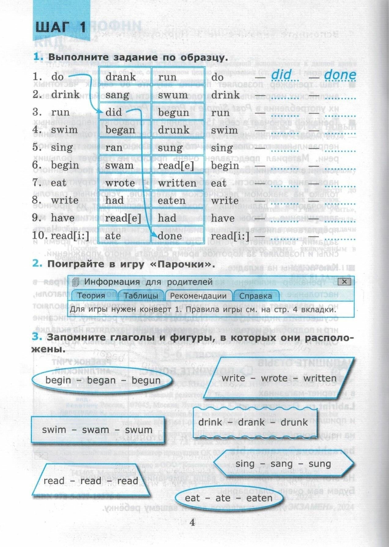 К сборнику прилагается отдельная книжка для родителей "Учимся учить", где даны 120 карточек для обучающих игр, подробные методические рекомендации и ключи ко всем заданиям. Помимо решения чисто практической задачи (выучить неправильные глаголы) задания развивают память и внимание.