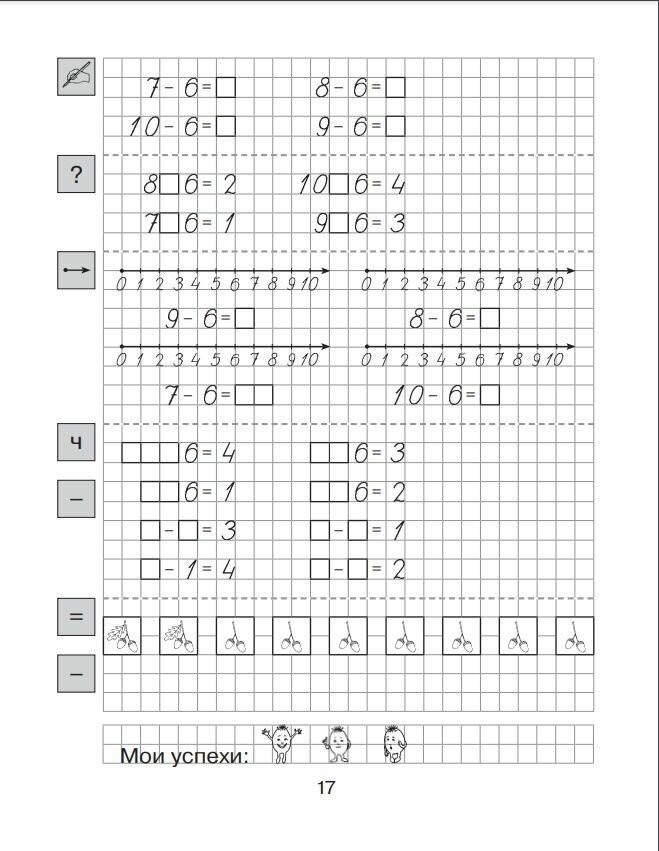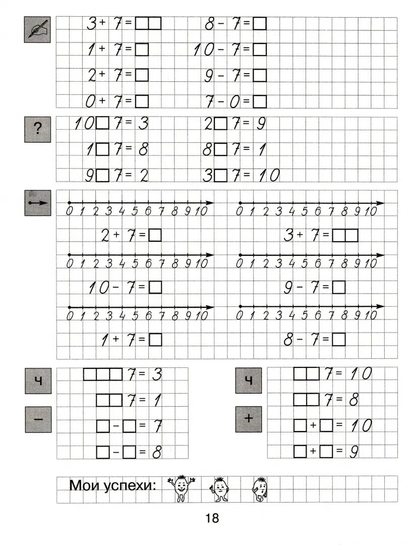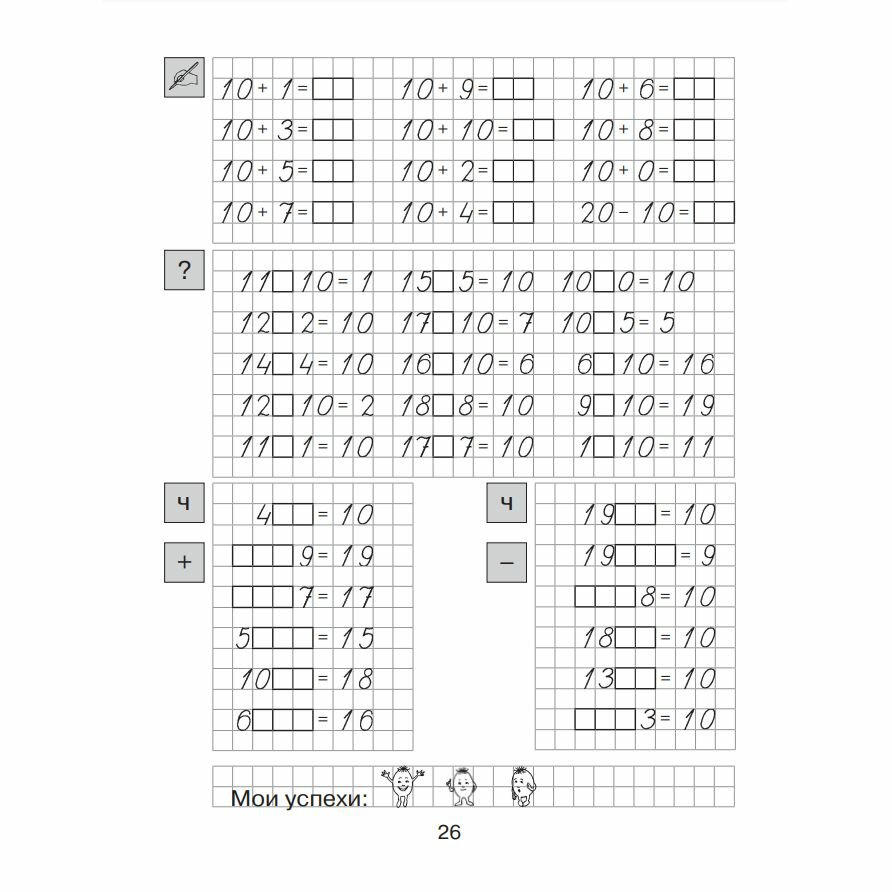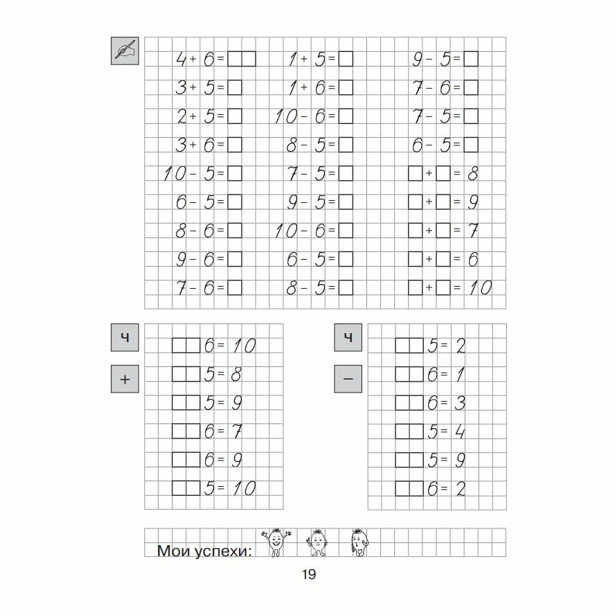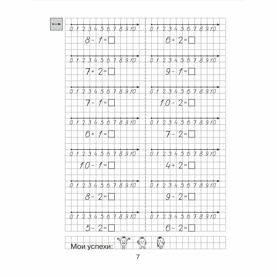 Пособие представляет собой тренажёр, предназначенный для организации самостоятельной работы первоклассников. Главная цель — формирование навыка устного счёта в пределах 20, что соответствует Примерной рабочей программе начального общего образования. На каждой странице размещены задания по одной теме, однако подобраны они с учетом усложнения, что позволит учителю организовать дифференцированный подход к учебной деятельности детей. Пособие можно использовать на этапах закрепления знаний, а также для их диагностики. Внизу каждой страницы есть графа "Мои успехи". Обвести фломастером подходящего человечка может как учитель (родитель), так и сам школьник, формирующий самооценку.