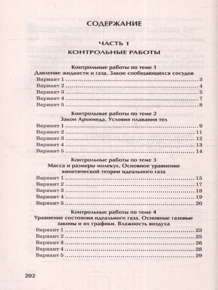 Каждая из 6 тем раздела "Гидродинамика. Молекулярная физика и термодинамика" включает в себя 5 контрольных работ, состоящих из 10 заданий разного уровня трудности. Их содержание аналогично приведенным в Открытом банке заданий и используемым на ЕГЭ по физике. Если уроки по физике спаренные, как это имеет место в наукоемких лицеях и гимназиях естественно-научного профиля, то учитель может предлагать учащимся решить контрольную работу полностью, а на обычном 45-минутном уроке достаточно решения половины заданий по выбору учителя. Все задания соответствуют Программе по физике для средней школы и способны надежно проверить уровень знаний старшеклассников.