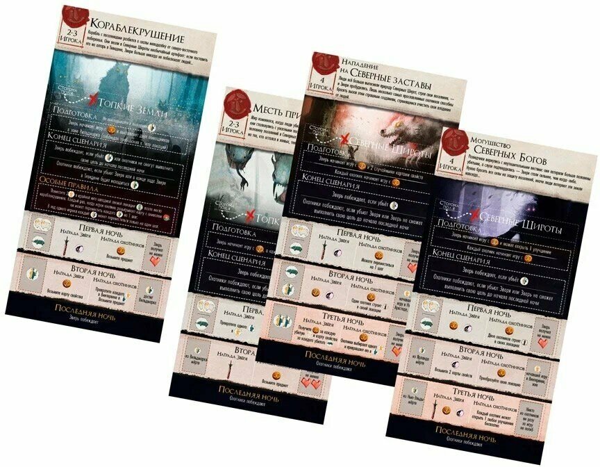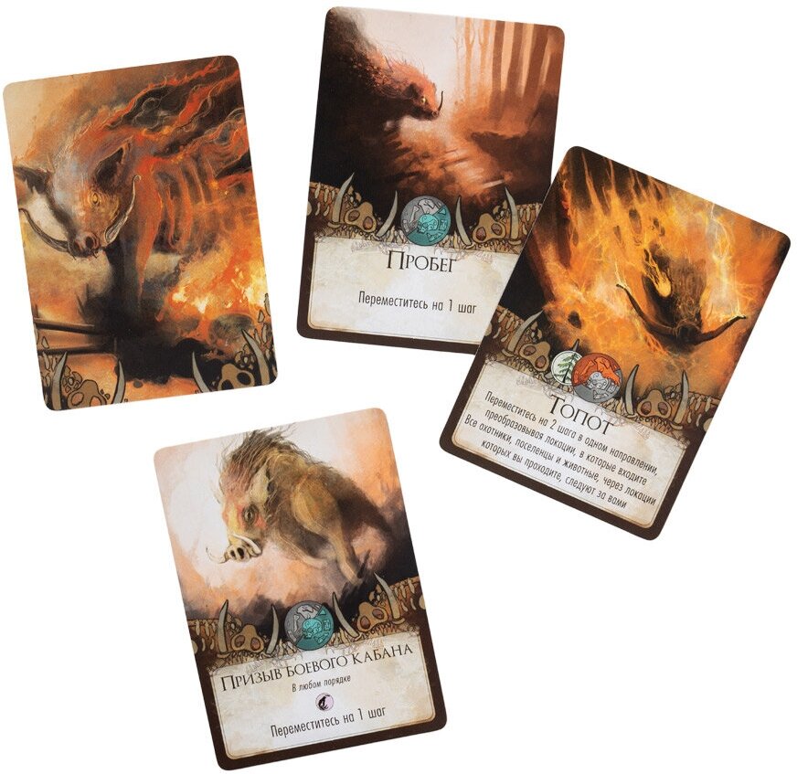 | Комплектация | 6 планшетов Зверей; 6 планшетов охотников; 6 картонных фигурок Зверей; 6 картонных фигурок охотников; 15 картонных фигурок помощников; 16 карт действий; 18 карт способностей охотников; 24 карты способностей Зверей; 48 карт движения Зверя; 25 карт предметов; 25 карт свойств Зверя; 18 жетонов гнева; 27 жетонов локаций; 19 маркеров улучшений; 30 жетонов следа; 3 жетона древней силы; 6 жетонов сторожевых вышек; 14 фигурок поселенцев; 28 фигурок овец; 19 фигурок кабанов; 4 фигурки медведей; 12 жетонов ранений; 2 листа сценария; мини-карта; ширма; жетон местонахождения; двухстороннее игровое поле; правила |