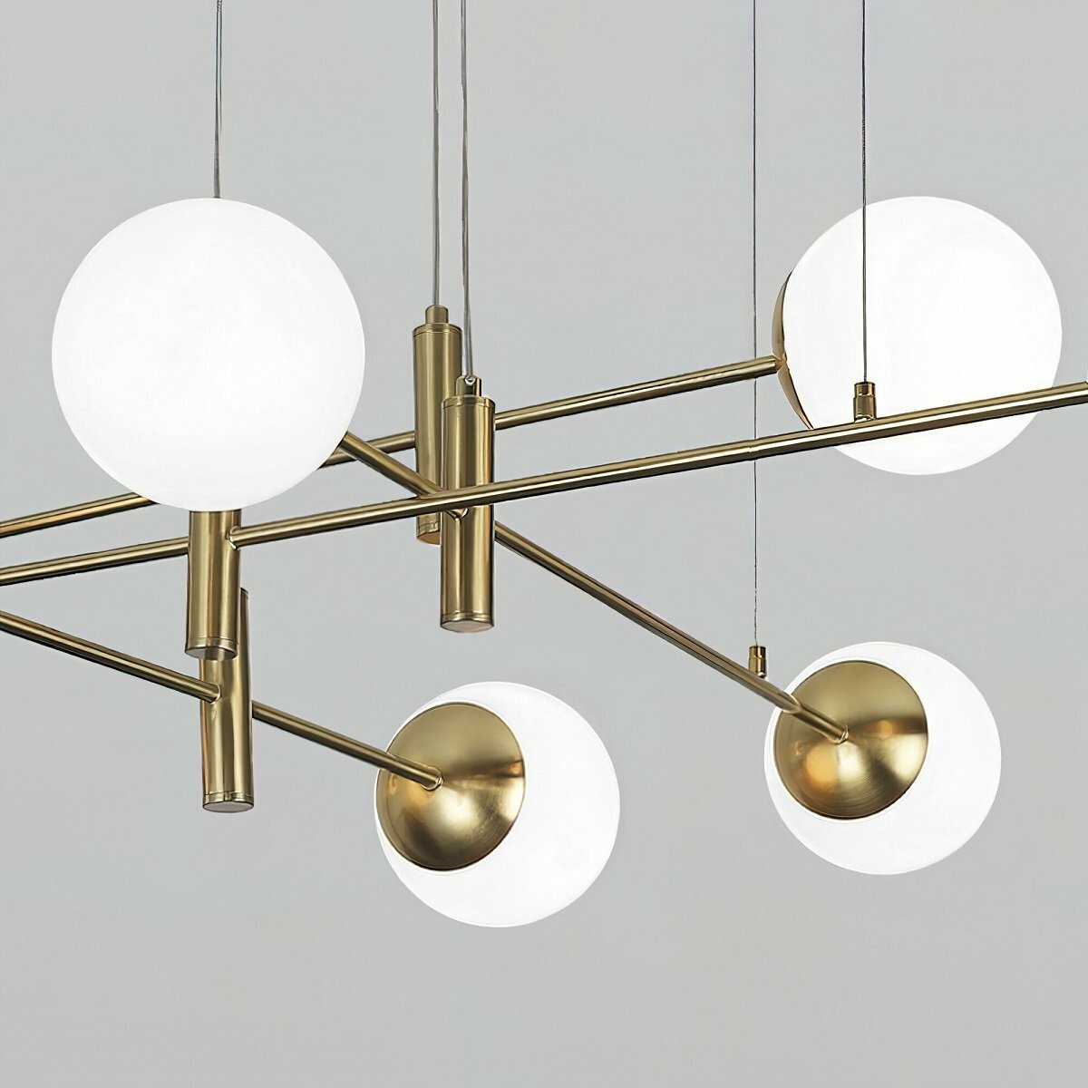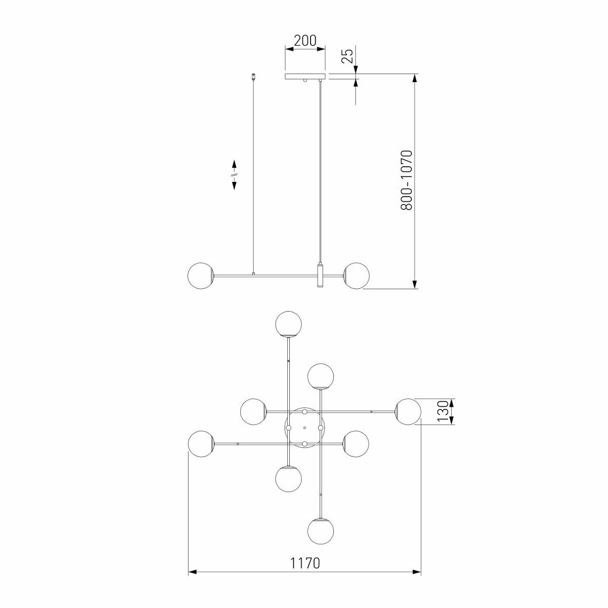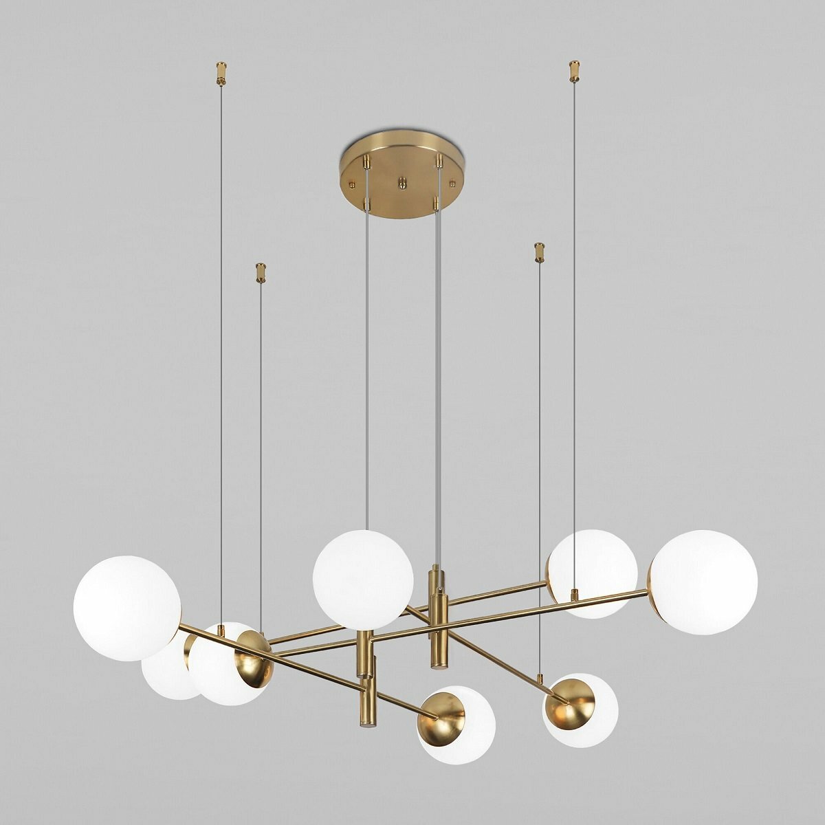 Подвесной светильник Eurosvet Planet 70146/8 цвета латунь с матовыми белыми плафонами из стекла организовать качественное освещение на площади 16 м кв. и украсить современный интерьер. В качестве источника света используются сменные лампы с цоколем Е27, рассчитанные на мощность 60 Вт. Светильник имеет функцию регулировки подвеса, с помощью которого можно регулировать высоту. Подвесной светильник устанавливается на любой вид потолков с помощью планки. В серии Planet представлены подвесные светильники с 6 и с 8 плафонами в цвете латунь и черный.