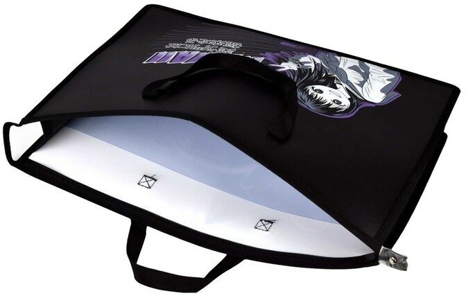 Папка очень понравилась. Хорошие удобные ручки, достаточно широкие, чтобы не резало руку. Вид стильный. Удобно всё складывать (донышко оформленное), размер А3 входит. Да, есть прозрачный карман внутри, на А4, для мелочей и небольших рисунков. Подростковый дизайн - самое то.