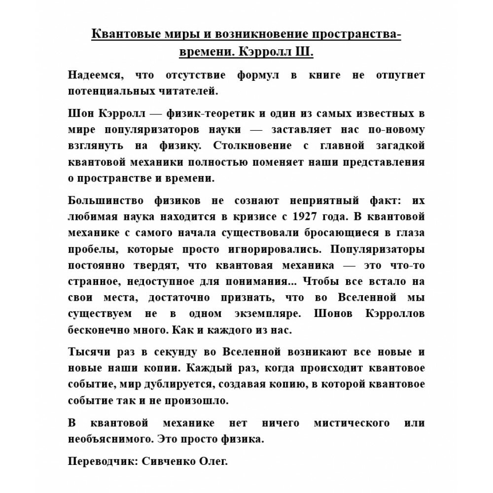 \"Квантовые миры и возникновение пространства-времени\" - это удивительная книга, которая заставляет нас пересмотреть наши представления о физике, пространстве и времени. Автор, Шон Кэрролл, является известным физиком-теоретиком и популяризатором науки, который делает сложные концепции доступными для широкой аудитории.