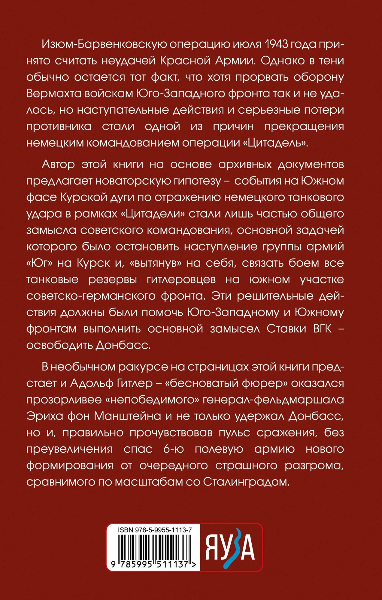 Изюм-Барвенковскую операцию июля 1943 года принято считать неудачей Красной Армии. Однако в тени обычно остается тот факт, что хотя прорвать оборону Вермахта войскам Юго-Западного фронта так и не удалось, но наступательные действия и серьезные потери противника стали одной из причин прекращения немецким командованием операции "Цитадель". Автор этой книги, на основе архивных документов, предлагает новаторскую гипотезу - события на Южном фасе Курской дуги по отражению немецкого танкового удара в рамках "Цитадели" стали лишь частью общего замысла советского командования, основной задачей которого было остановить наступление группы армий "Юг" на Курск и, "вытянув" на себя, связать боем все танковые резервы гитлеровцев на южном участке Советско-германского фронта. Эти решительные действия должны были помочь Юго-Западному и Южному фронтам выполнить основной замысел Ставки ВГК - освободить Донбасса. В необычном ракурсе на станицах этой книги предстает и Адольф Гитлер - "бесноватый фюрер" оказался прозорливее "непобедимого" генерал-фельдмаршала Эриха фон Манштейна и не только удержал Донбасс, но и, правильно прочувствовав пульс сражения, без преувеличения спас 6-ю полевую армию нового формирования от очередного страшного разгрома, сравнимого по масштабом со Сталинградом.