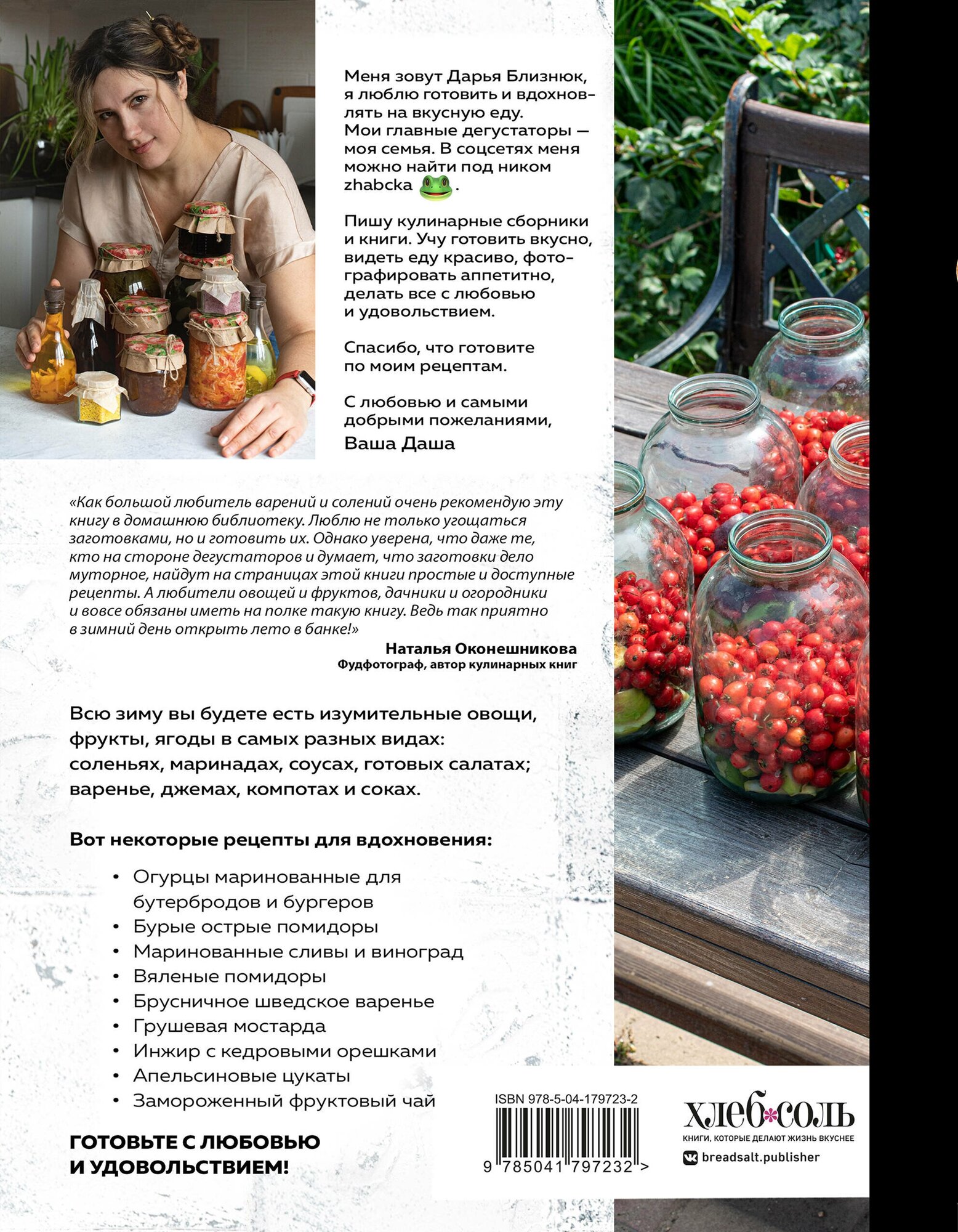 У Даши Близнюк - давно созданная и все возрастающая аудитория поклонников. Она есть и ВКонтакте и в Телеграм. Ее рецепты узнают, ждут, готовят по ним и выкладывают счастливые отзывы. Потому что получается все и очень вкусно. Эта книга - пятая. Первой была о Пасхе, затем о тортах, не забыла автор и про семейные обеды, и про магию пирогов. И вот теперь представила очень любимую ей самой тему консервирования. Во-первых, в начале, Даша рассказывает, как она готовится к этому процессу. Во-вторых, разумеется, предлагает более 50 рецептов заготовок из овощей и фруктов, салатов и закусок, соусов, которые сейчас пользуются особым спросом, и напитков. Все блюда приготовлены и сфотографированы автором, сопровождаются дельными советами и непосредственными ее эмоциями. Вкусно, полезно, уютно!