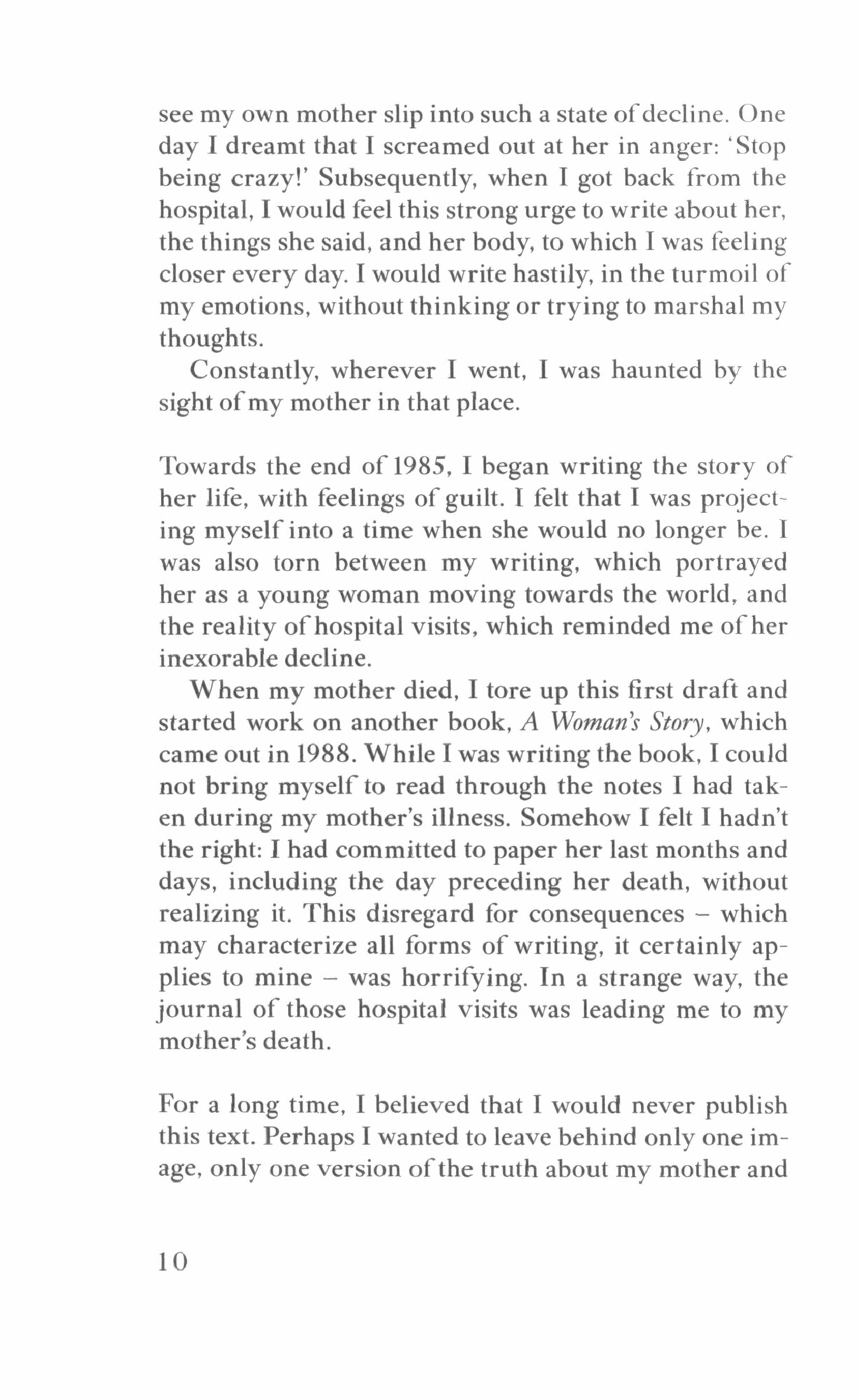 A powerful meditation on ageing and familial love, I Remain in Darkness recounts Annie Ernaux's attempts to help her mother recover from Alzheimer's disease, and then, when that proves futile, to bear witness to the older woman's gradual decline and her own experience as a daughter losing a beloved parent. Haunting and devastatingly poignant, I Remain in Darkness showcases Ernaux's unique talent for evoking life's darkest and most bewildering episodes.