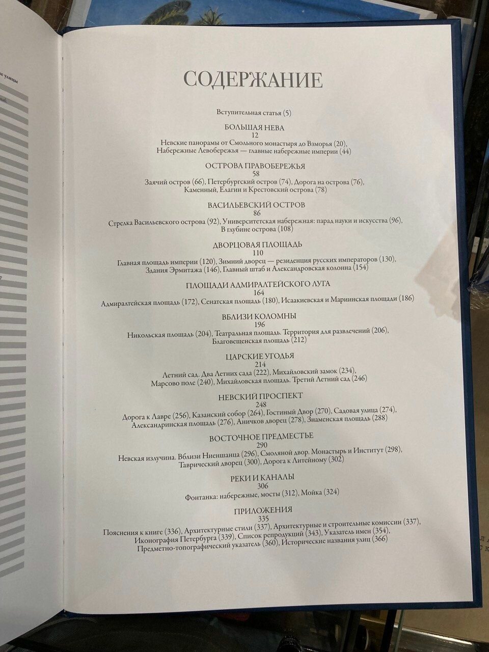 Каждый из десяти разделов книги открывается статьей об истории застройки территории, крупнейших сооружениях и ансамблях, расположенных на ней. В приложениях помещены короткие статьи об архитектурных стилях, иконографии, строительных и архитектурных комиссиях, подробный список иллюстраций, указатель имен и предметно-топографический указатель.