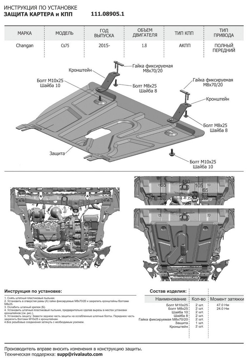 | Комплектация | защита - 1 шт., комплект крепежа, инструкция по установке, упаковка |