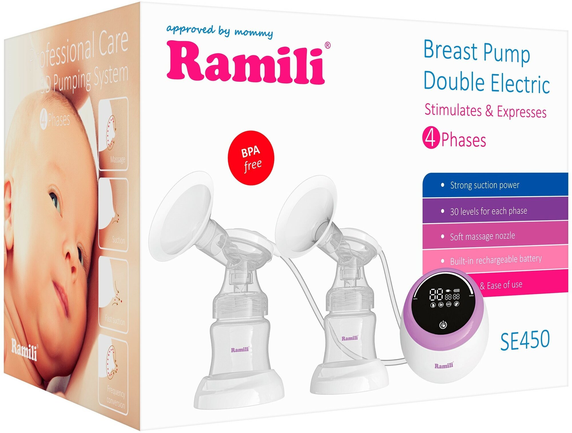 Беспроводной электрический четырехфазный молокоотсос Ramili SE450 обеспечен всеми необходимыми функциями для комфортного сцеживания грудного молока: