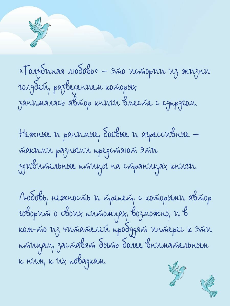 "Голубиная любовь" - это истории из жизни голубей, разведением которых занималась автор книги вместе с супругом. Нежные и ранимые, боевые и агрессивные, сильные и готовые постоять за себя и свою половину - такими разными предстают эти удивительные птицы на страницах книги.